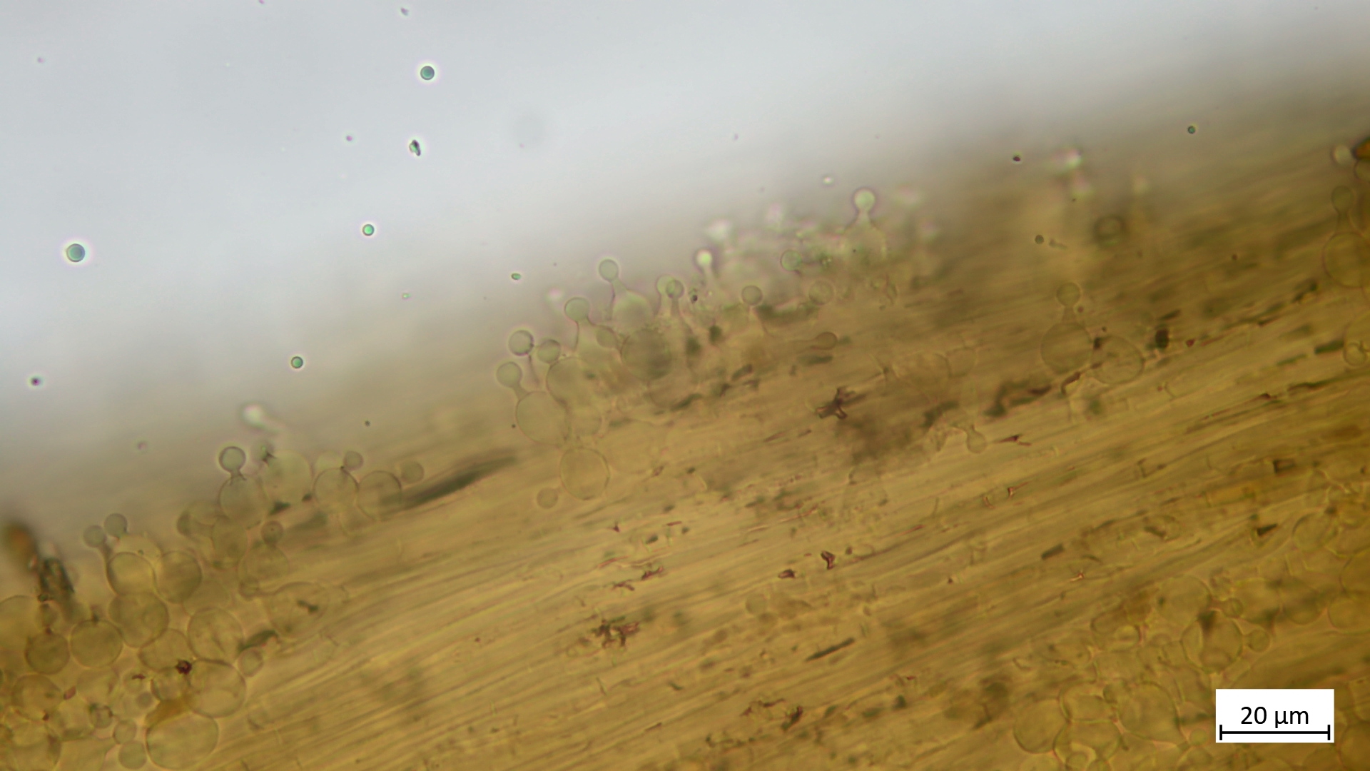 Hier noch ein Bild vom Lamellenansatz am Stiel unterm Mikro, hat für den Fund wenig Aussagekraft, ich fands aber trotzdem spannend: