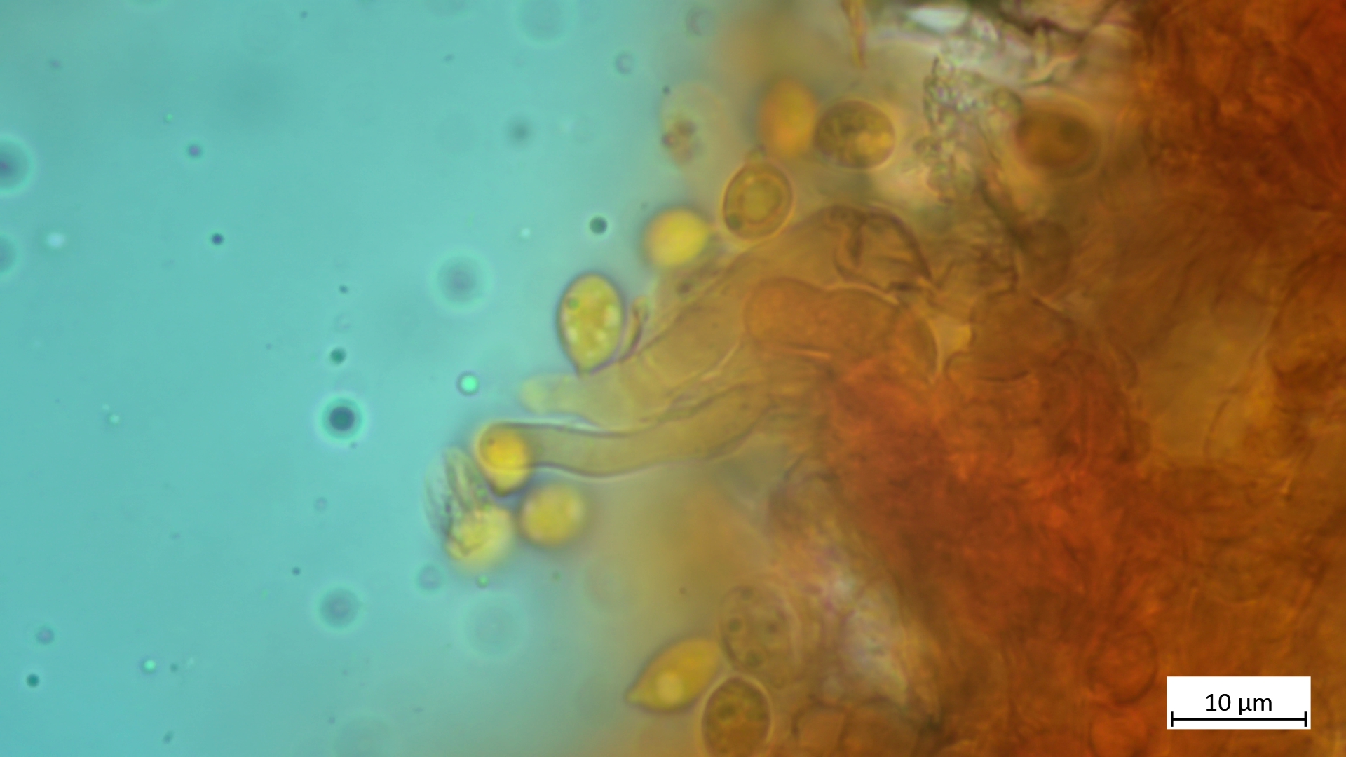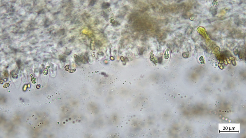Sporen mit kräftigem Apikulus ca. 8,1 x 5,7 (nur zwei gemessen, durchaus variabler im Sporenbild), ovoid, amygdaliform wirkend