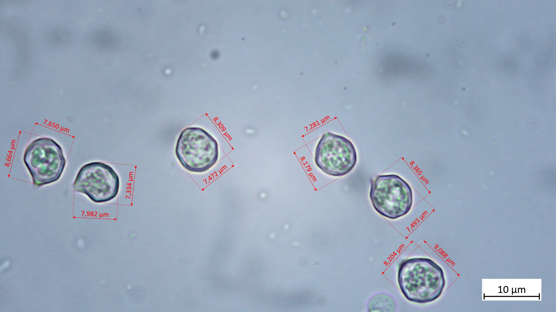 8,0-9,1 µm (av. 8,5 µm, SD 0,4 µm) x 7,3-8,2 µm (av. 7,6 µm, SD 0,3 µm); Q = 1,1-1,1 (av. 1,1, SD 0,0)(n = 6)