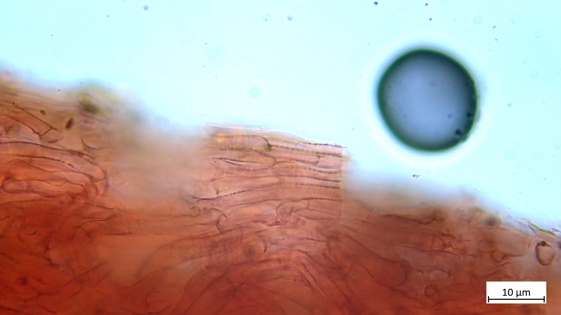 Hier noch ein Bild vom Lamellenansatz am Stiel unterm Mikro, hat für den Fund wenig Aussagekraft, ich fands aber trotzdem spannend: