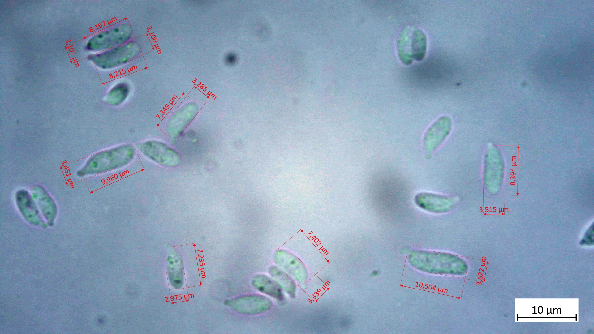 Sporen typisch: 6,1-7,3 µm (av. 6,6 µm, SD 0,3 µm) x 3,5-4,5 µm (av. 3,9 µm, SD 0,2 µm); Q = 1,5-1,8 (av. 1,7, SD 0,1)(n = 18)