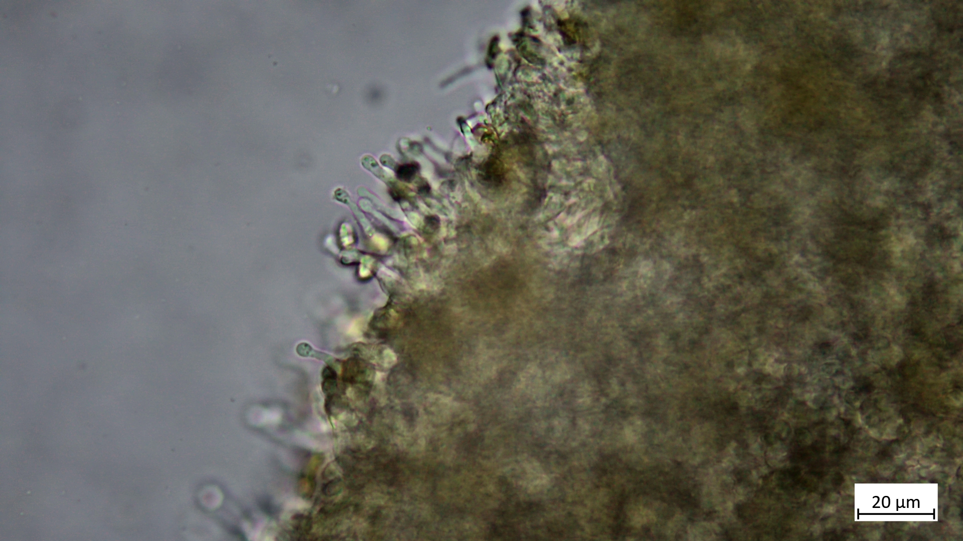 Die Hutdeckschicht zeigt sich mit stark inkrustierten Hyphen: