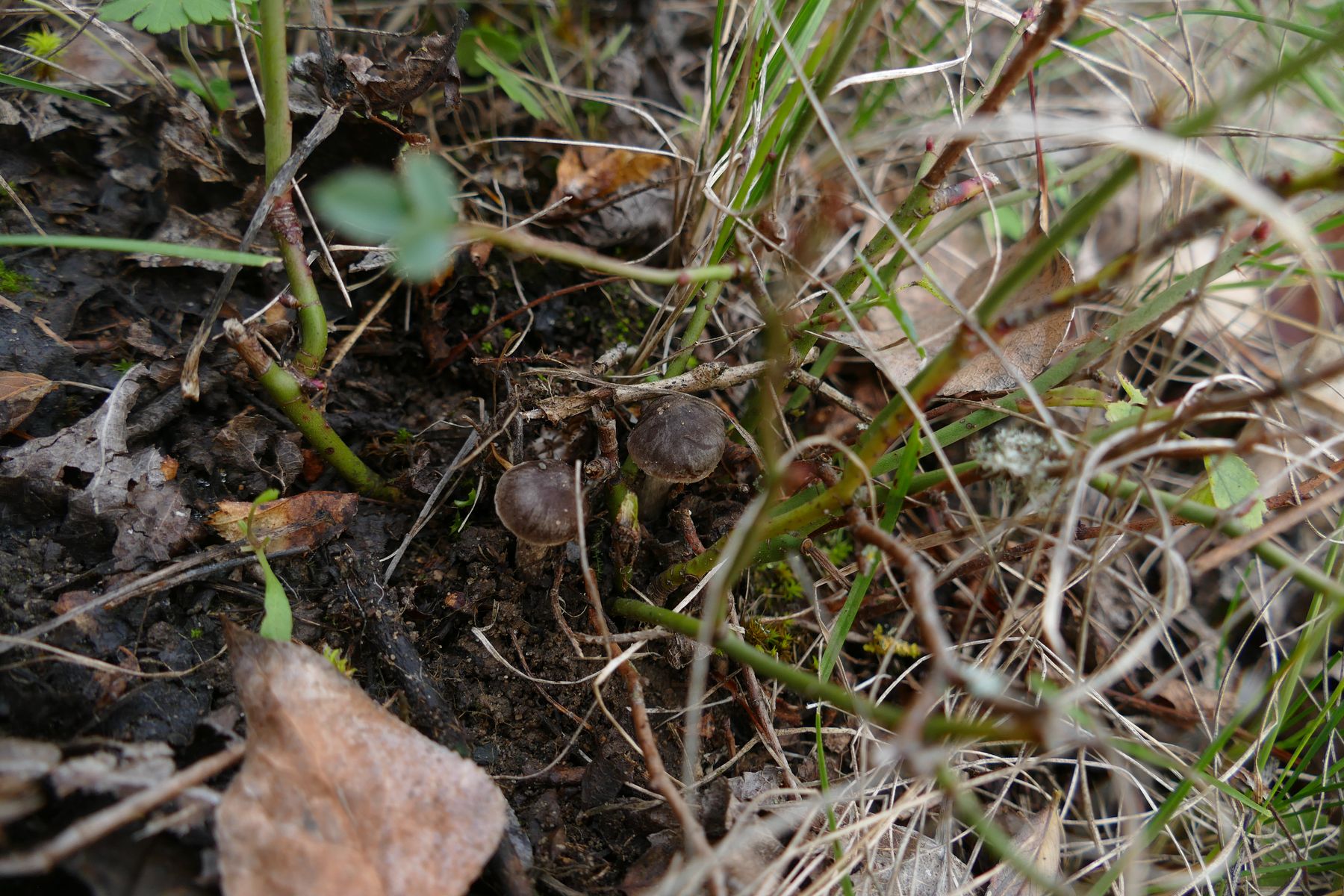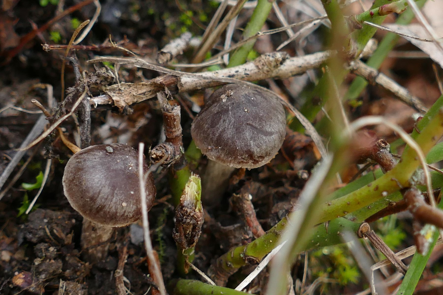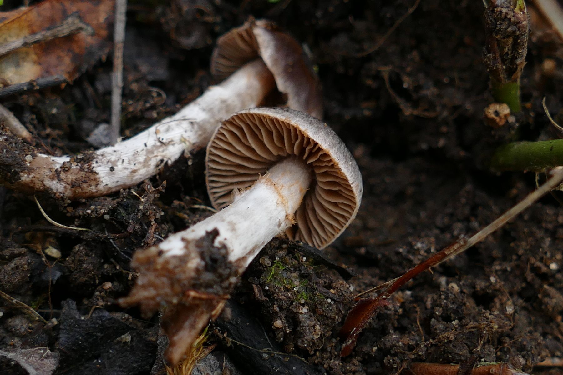 Leider nur zwei kleine Fruchtkörper, vermutlich auch noch recht jung, insgesamt sehr dunkel mit herablaufenden, auffällig dicken Lamellen: