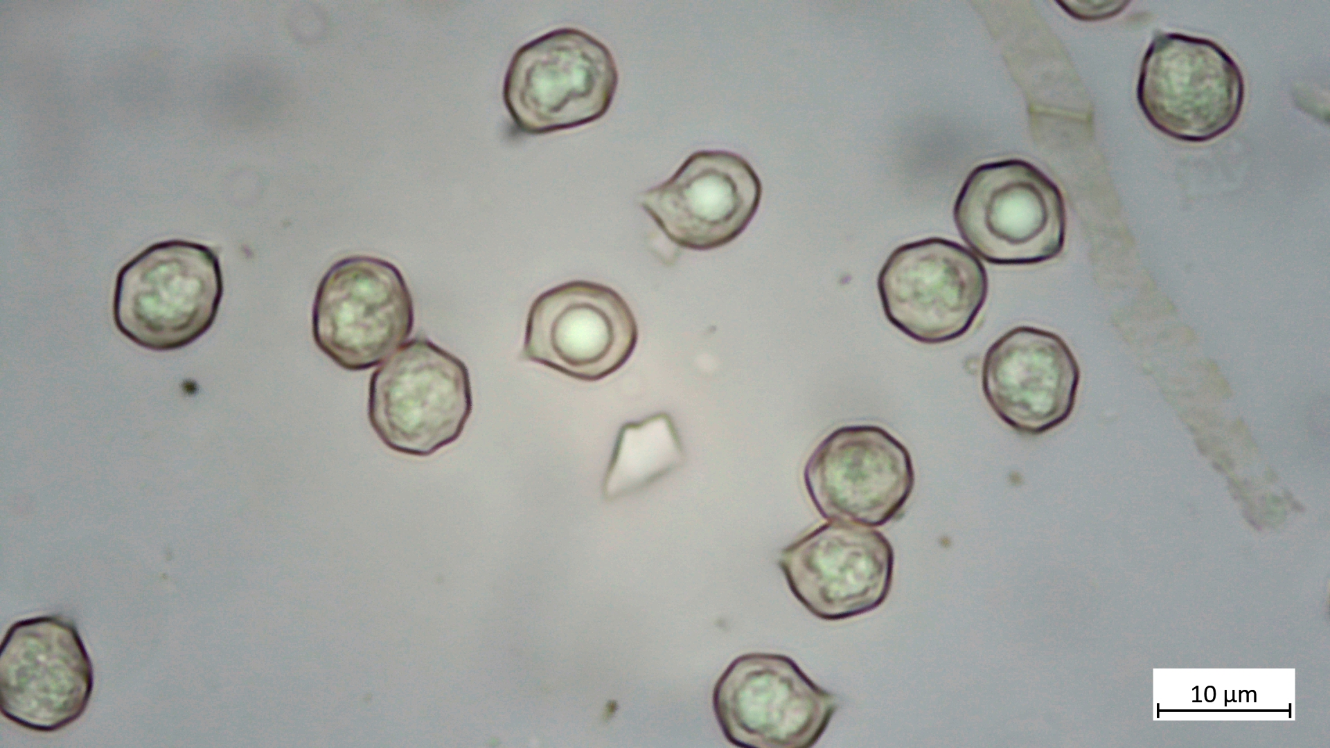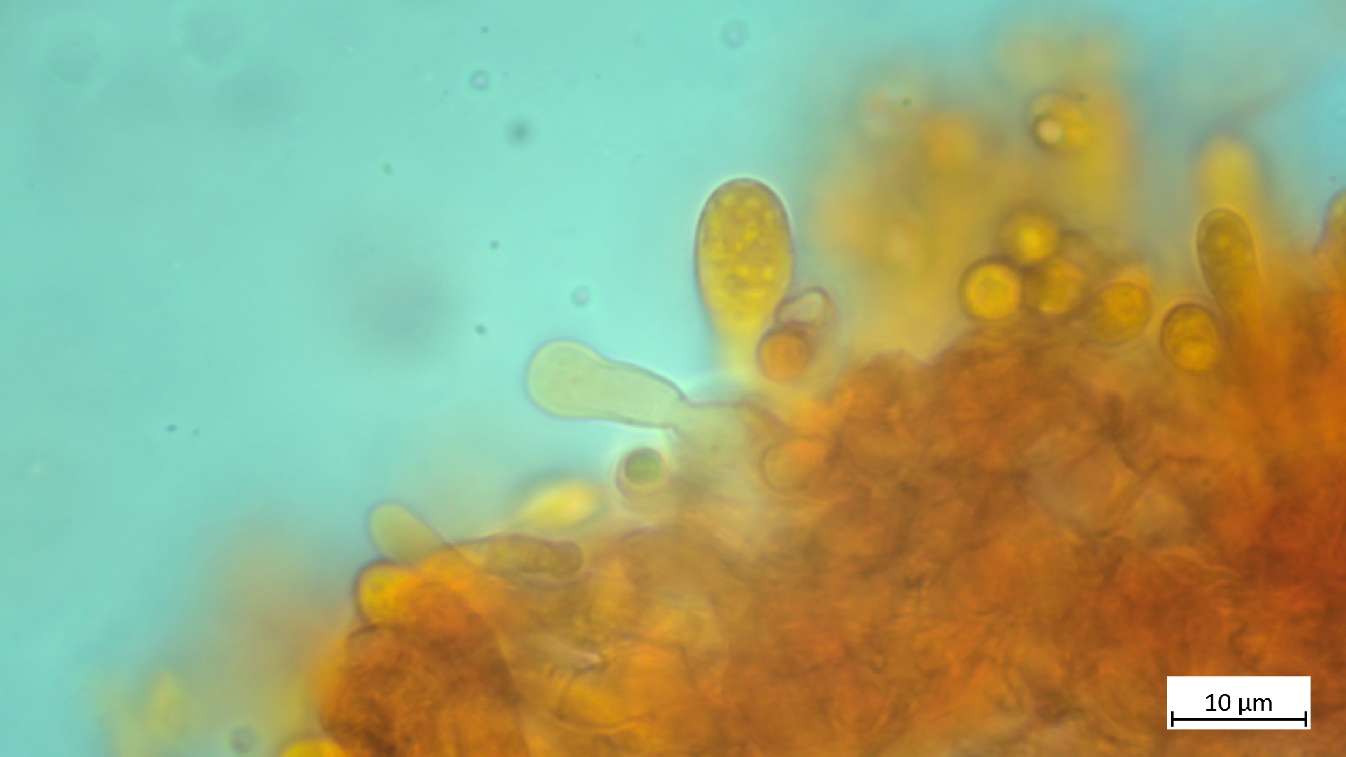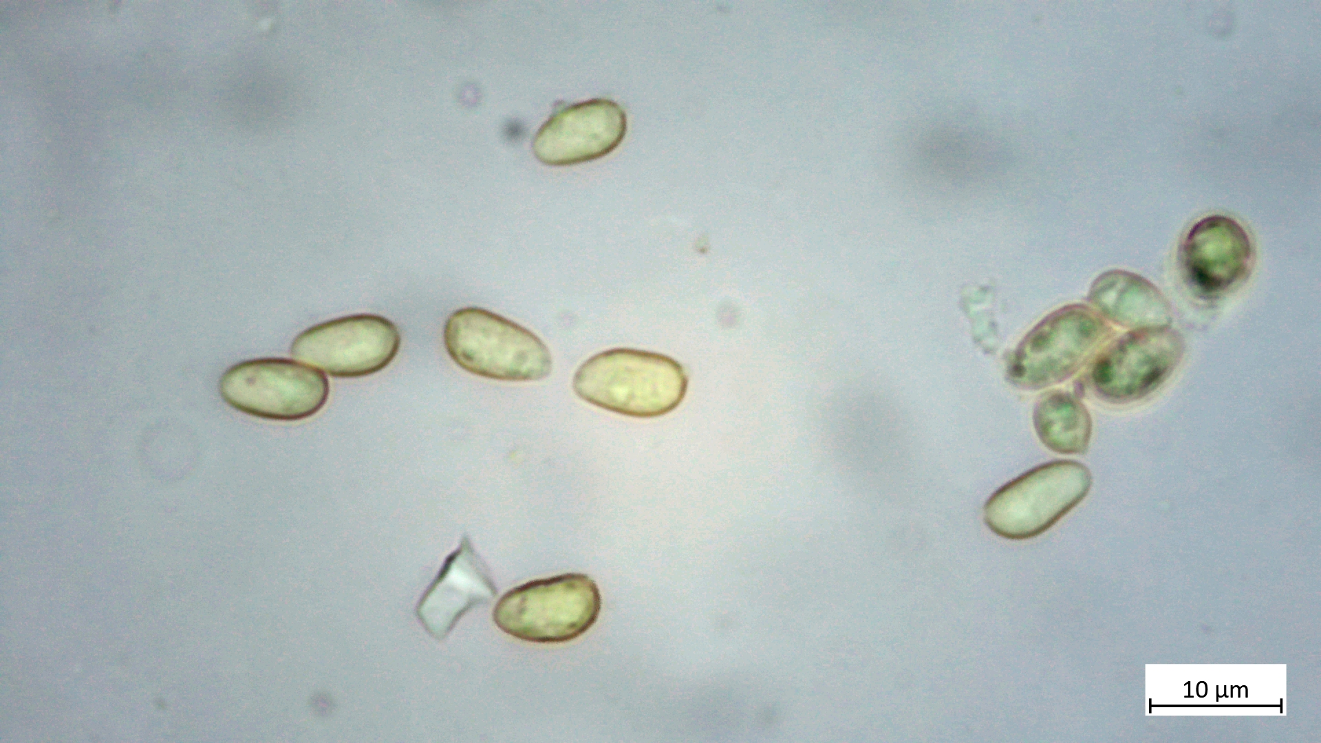 Sporen mit kräftigem Apikulus ca. 8,1 x 5,7 (nur zwei gemessen, durchaus variabler im Sporenbild), ovoid, amygdaliform wirkend