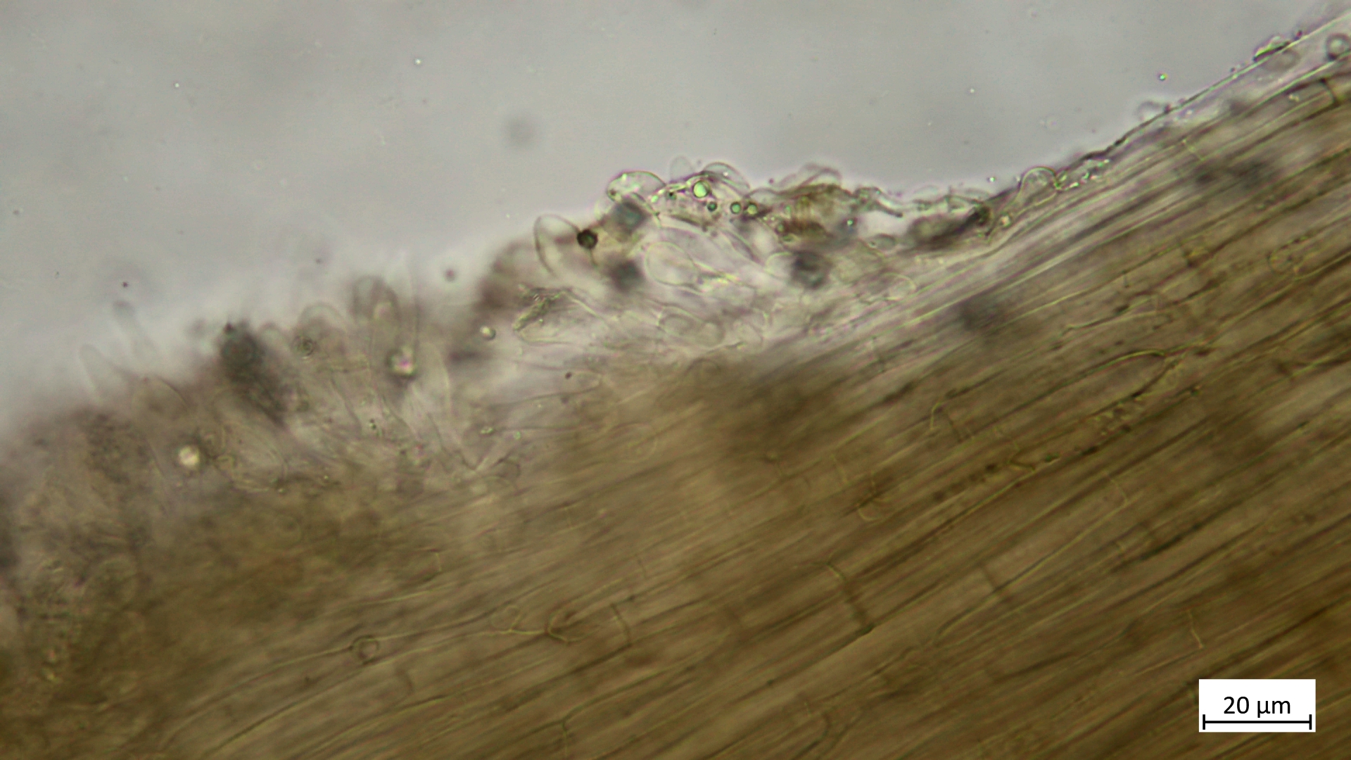Die Hutdeckschicht zeigt sich mit stark inkrustierten Hyphen: