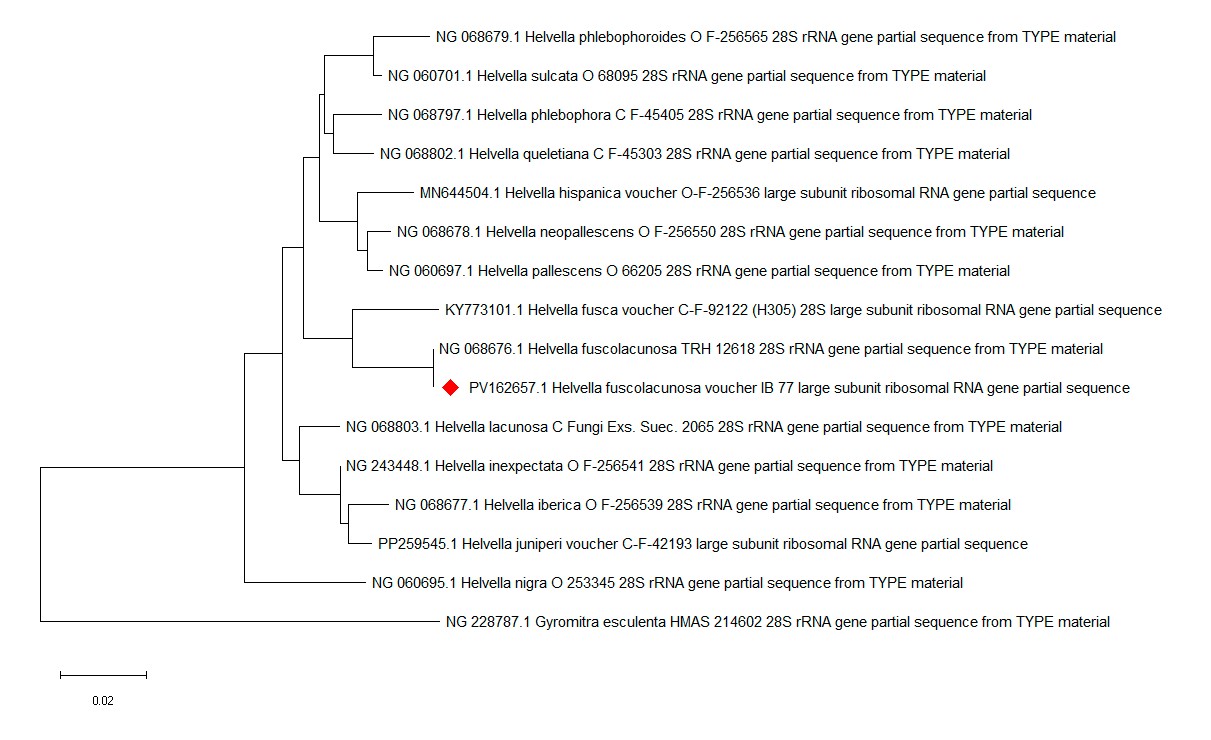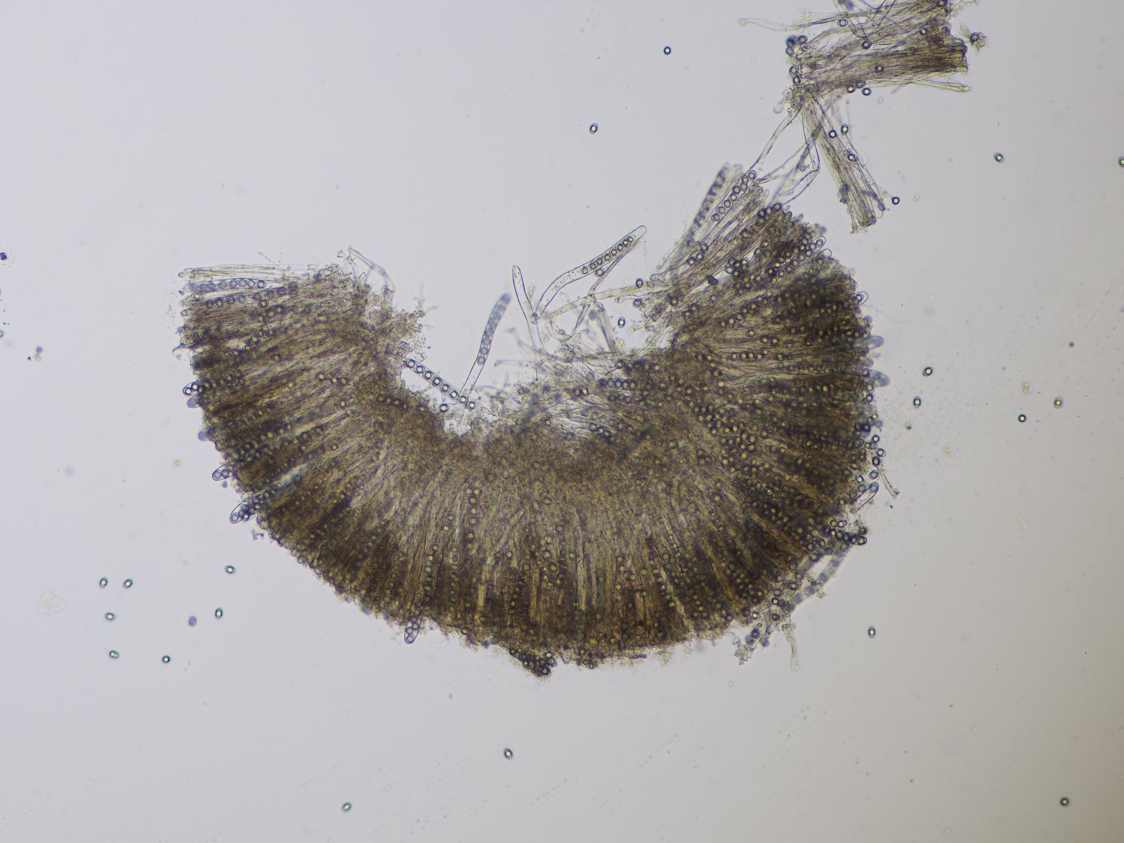 Als Alternative (falls man das Hymenium eher als braun einschätzen würde) sollte es H. fusca sein, für die wird der Stiel als "white" angegeben. Als braun empfinde ich das Hymenium makroskopisch zwar nicht, im mikroskopischen Schnitt kommen allerdings einige Brauntöne raus.