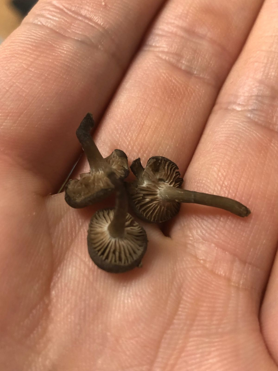 Hut: Grau, überfasert filzig wirkend, im Alter am Rand eingerissen wie Inocybe, Hutdurchmesser 13mm