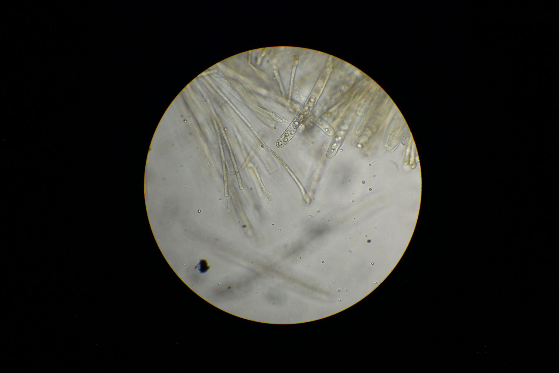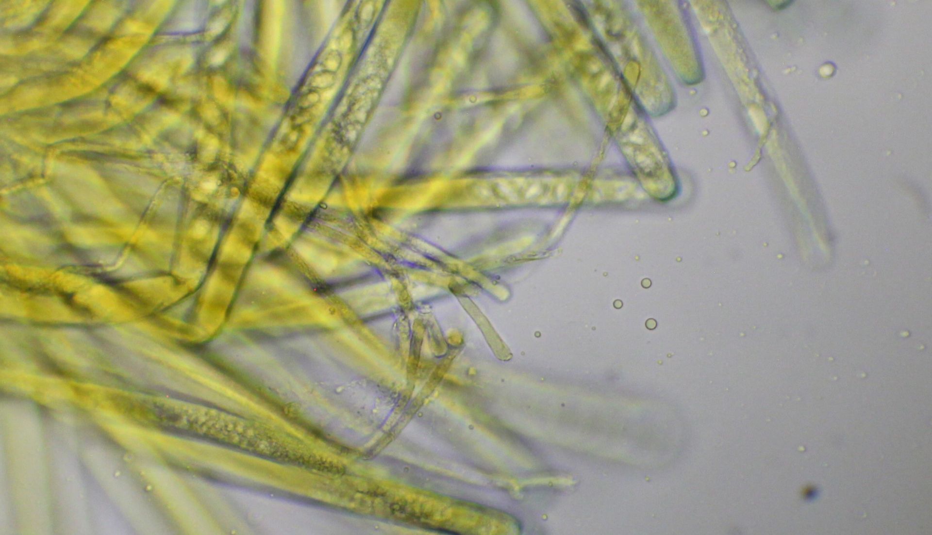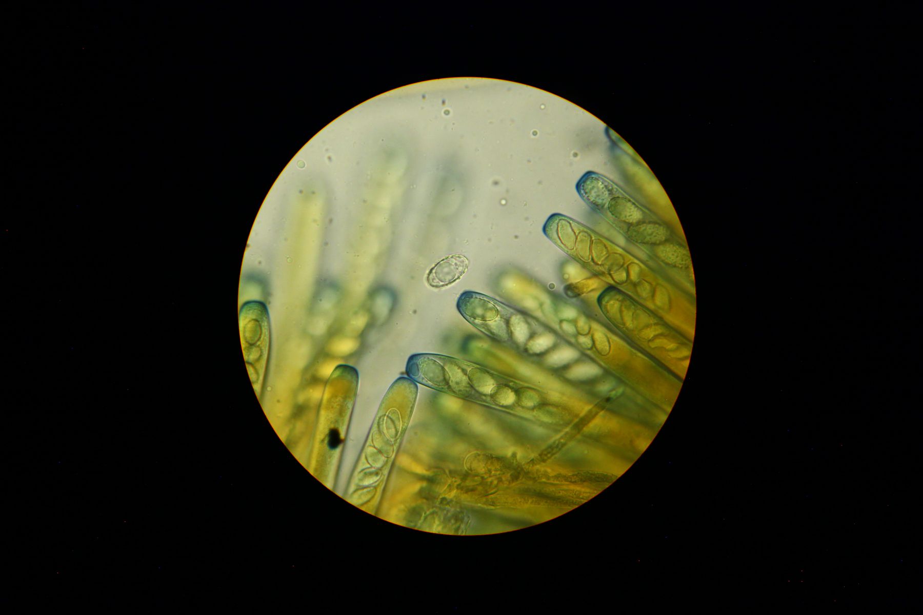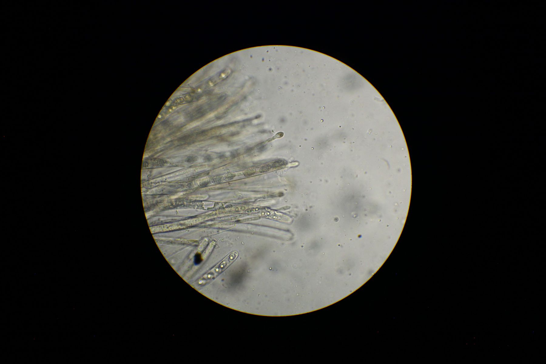 anbei die angesprochenen Bilder der Sporen in BWB/Milchsäure und Paraphysen in Wasser. Die Paraphysen scheinen gelb/grün gefüllt zu sein. Um ganz sicher zu gehen, habe ich die Sporen nochmals in Wasser gemessen und bin immer noch bei 17-18 x 9-10 (-11).