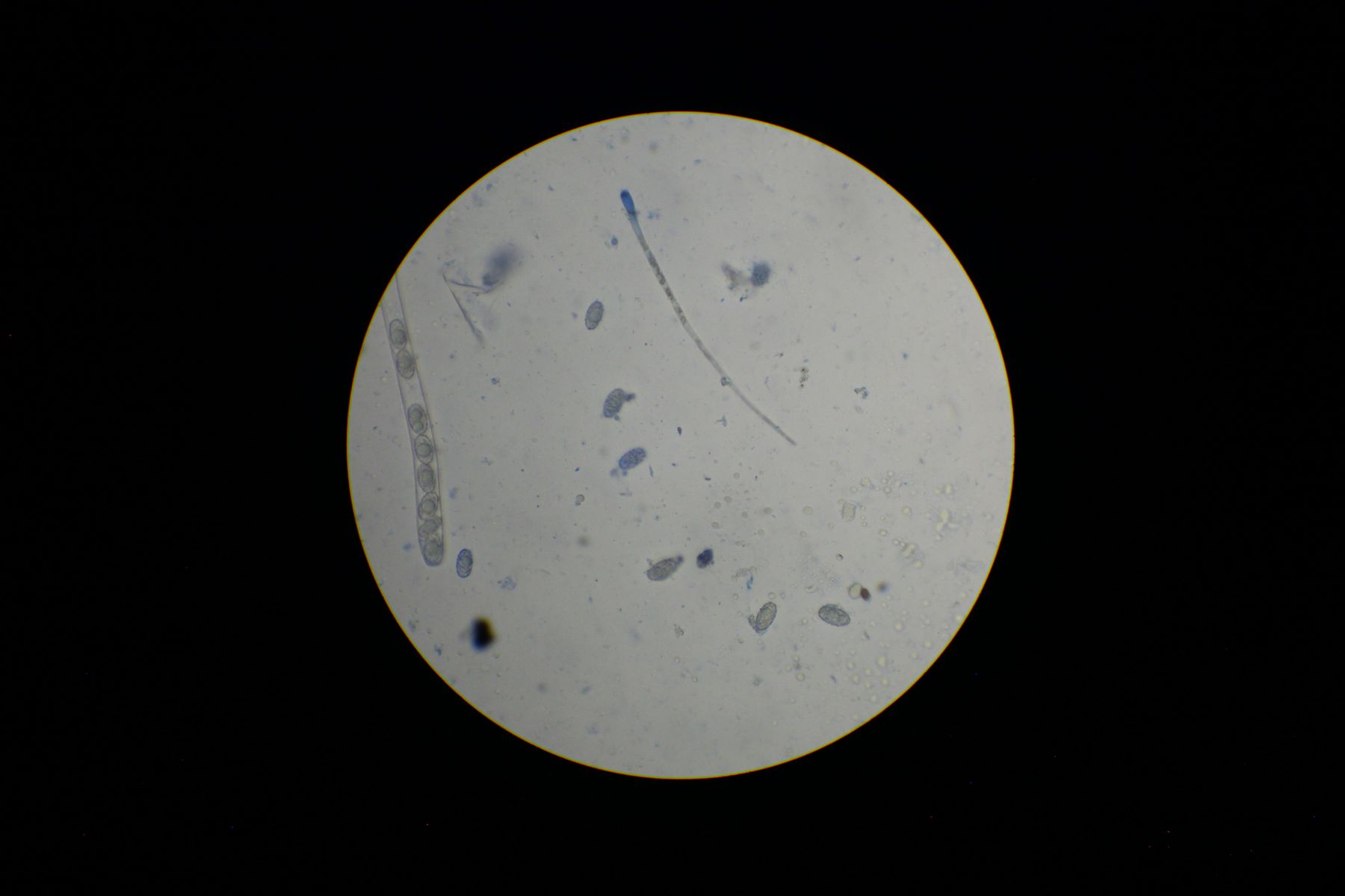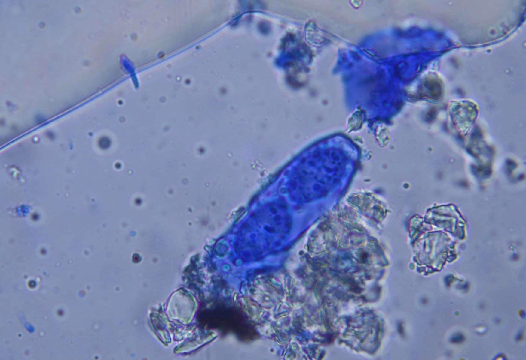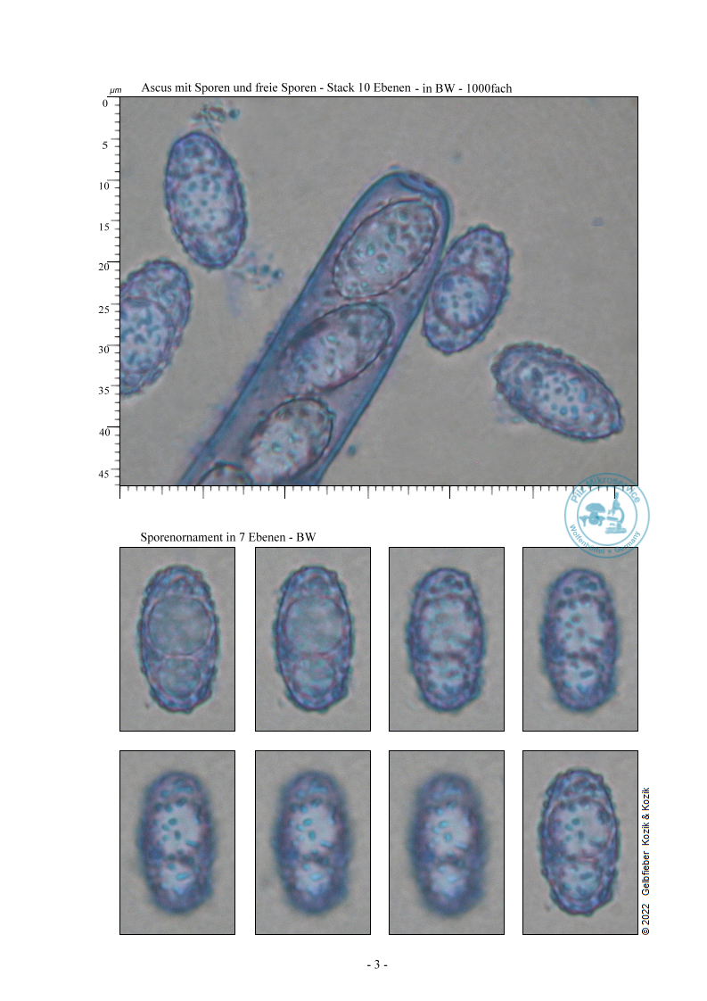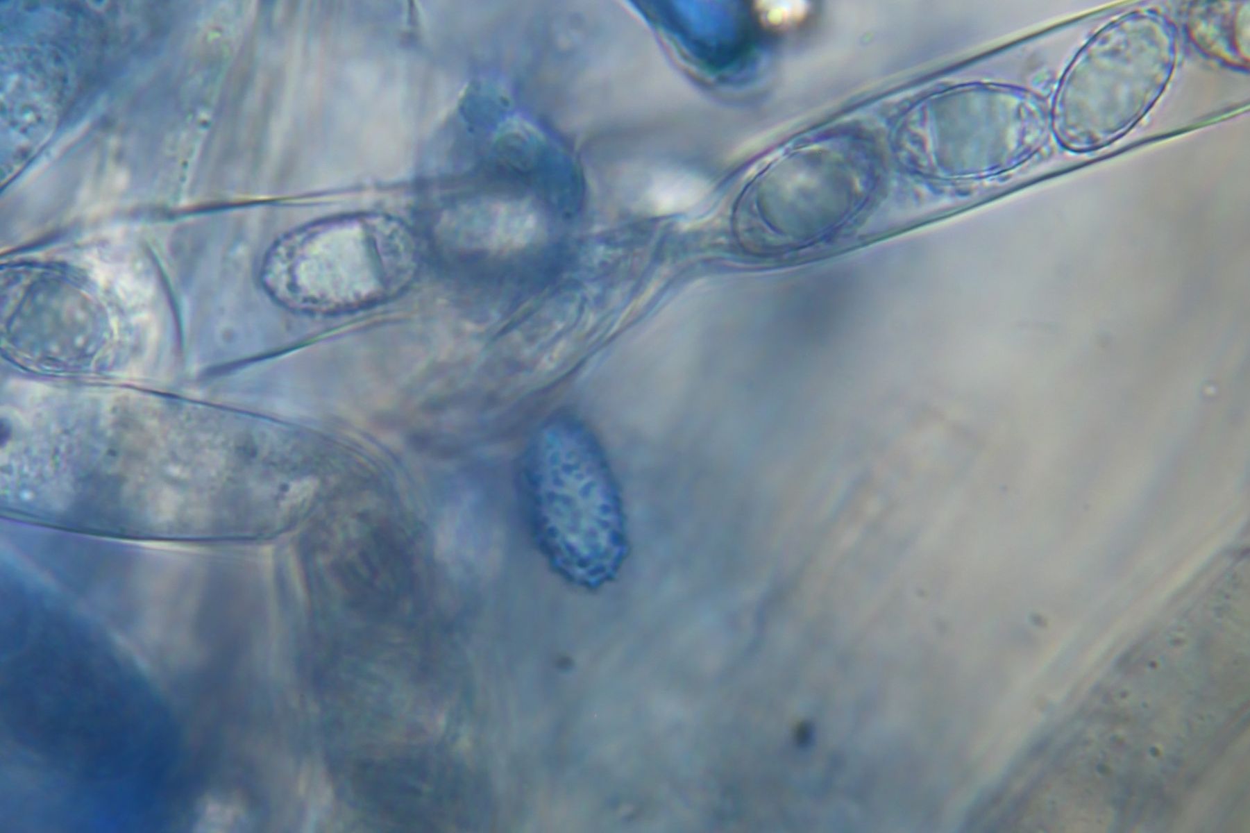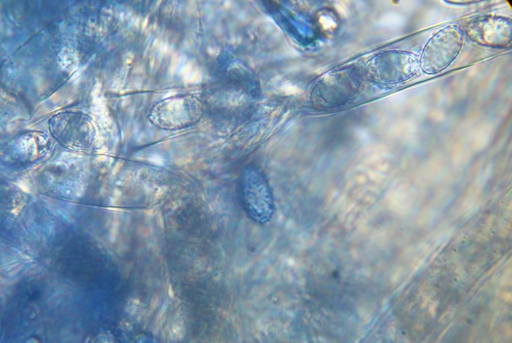 ich hab zwar ein 100x Objektiv, aber es war nicht sehr einfach damit gute Bilder von Sporen zu machen. Besonders, weil man beim Färben, alles wegspült. Hier habe ich heute versucht noch schöne Bilder zu machen und auf einigen sieht man das Ornament doch ganz gut. Die meisten Sporen sitzen zwar noch in den Ascis, aber die reifen Sporen waren genauso wie die Sporen auf den Bildern ornamentiert. Mir scheint, dass die Sporen deiner Beschreibung von P. succosella gut passen.