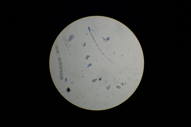 Sporen in H2O; überwiegend mit einem Öltropfen, einige Sporen mit zweitem kleineren Öltropfen