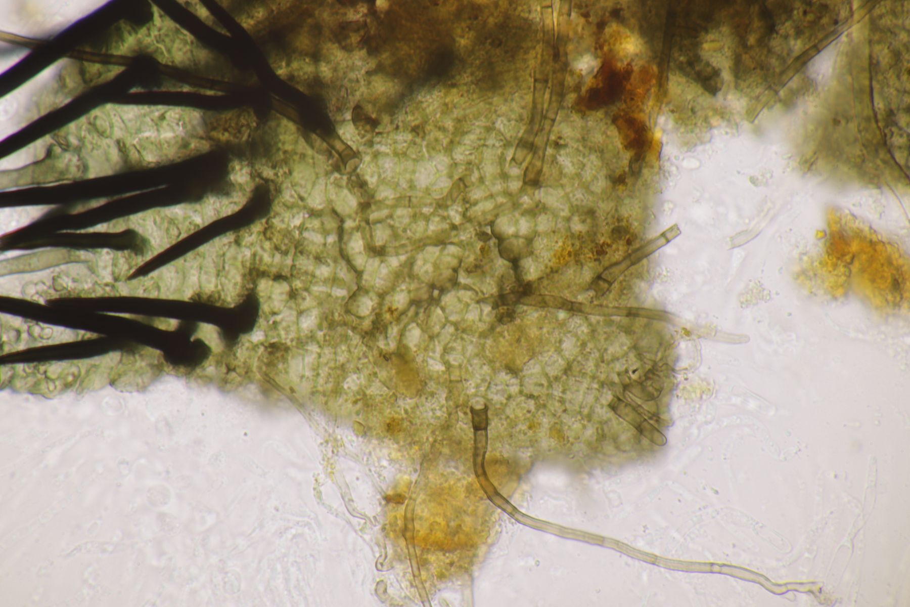 2. Eine Trichodelitschia mit Sporen von 24-26.5 µm. Im ersten Fruchtkörper gab es leider nur Sporen, an denen sich die Gelhülle nicht beurteilen ließ. Aber in weiteren Exemplaren gab es dann auch hübsche Sporen mit dreiteiliger Gelhülle, also T. minuta