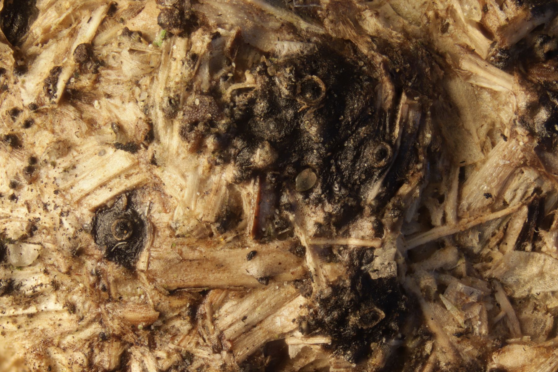 2. Eine Hypocopra auf Kaninchen. Sporen messen 24.2-27.1 µm x 12.0-13.1 µm, sind leicht asymmetrisch und in jungem Zustand zweizellig. Die Keimspalte nimmt nur einen Teil der Spore ein und mißt ca. 15 µm. Der Apikalapparat ist komplett amyloid. Da wenigstens teilweise mehrere Perithecien in je Stroma vorhanden sind, lande ich bei Hypocopra brefeldii.