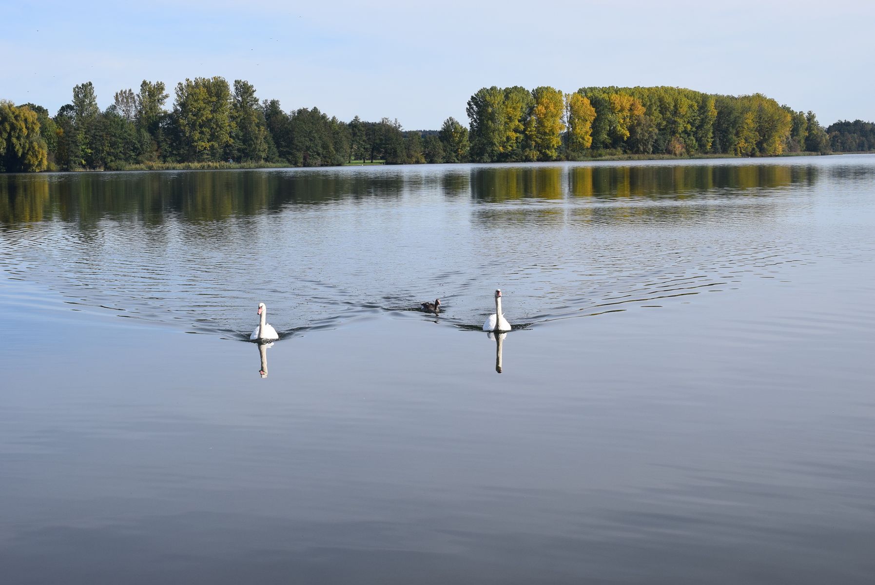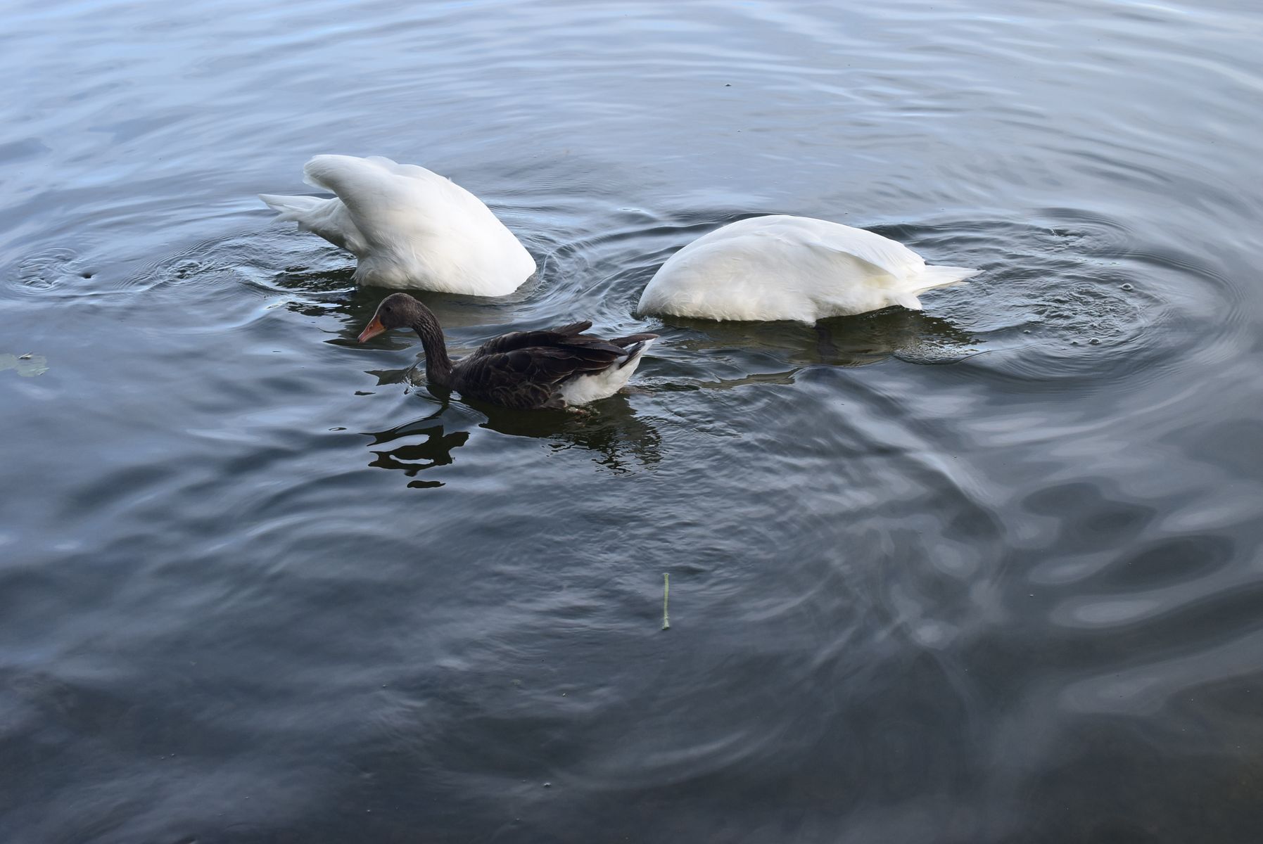 Lustige Gesellschaft - Schwäne und Wildgans wie eine Familie . Wie aus Märchen Hässliche Entlein nur dieses mal verkehrt