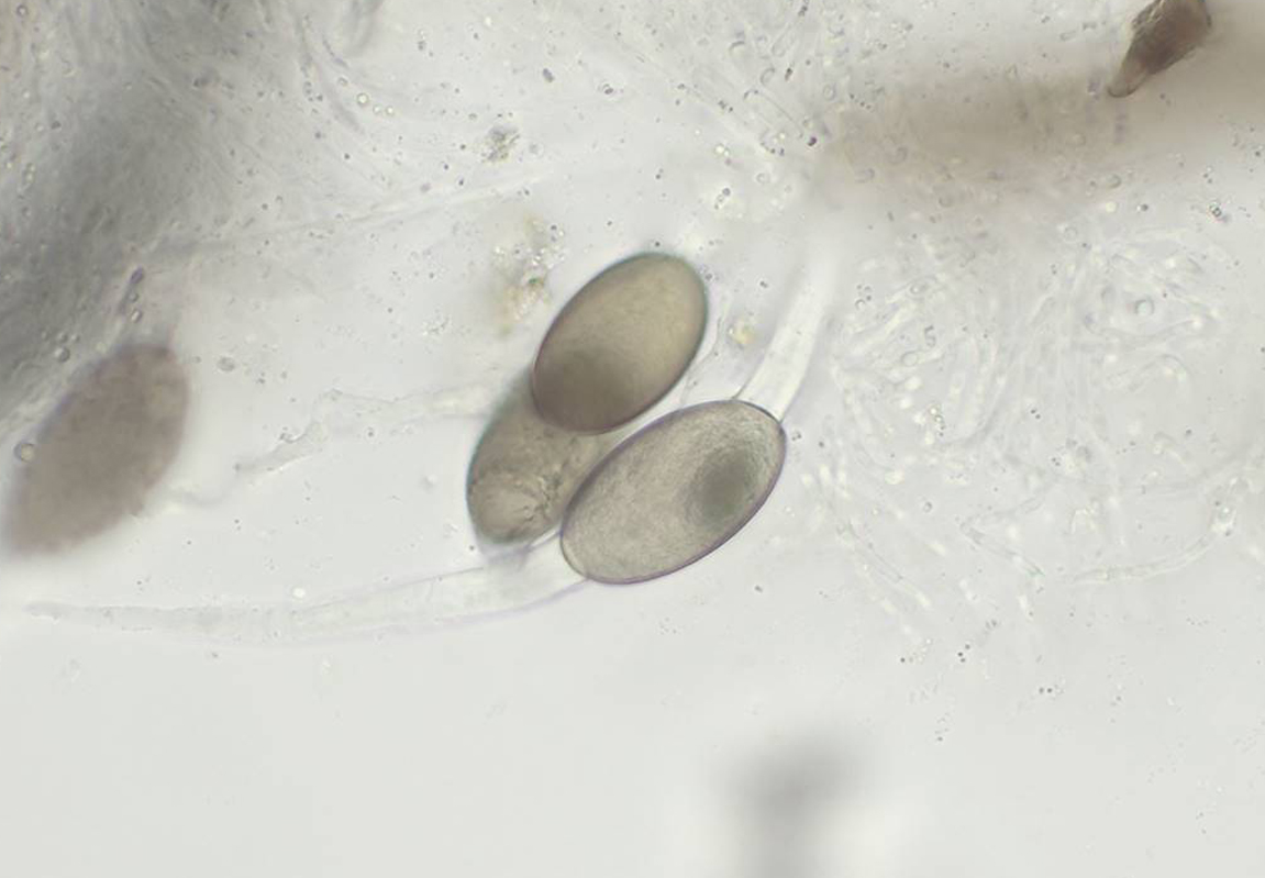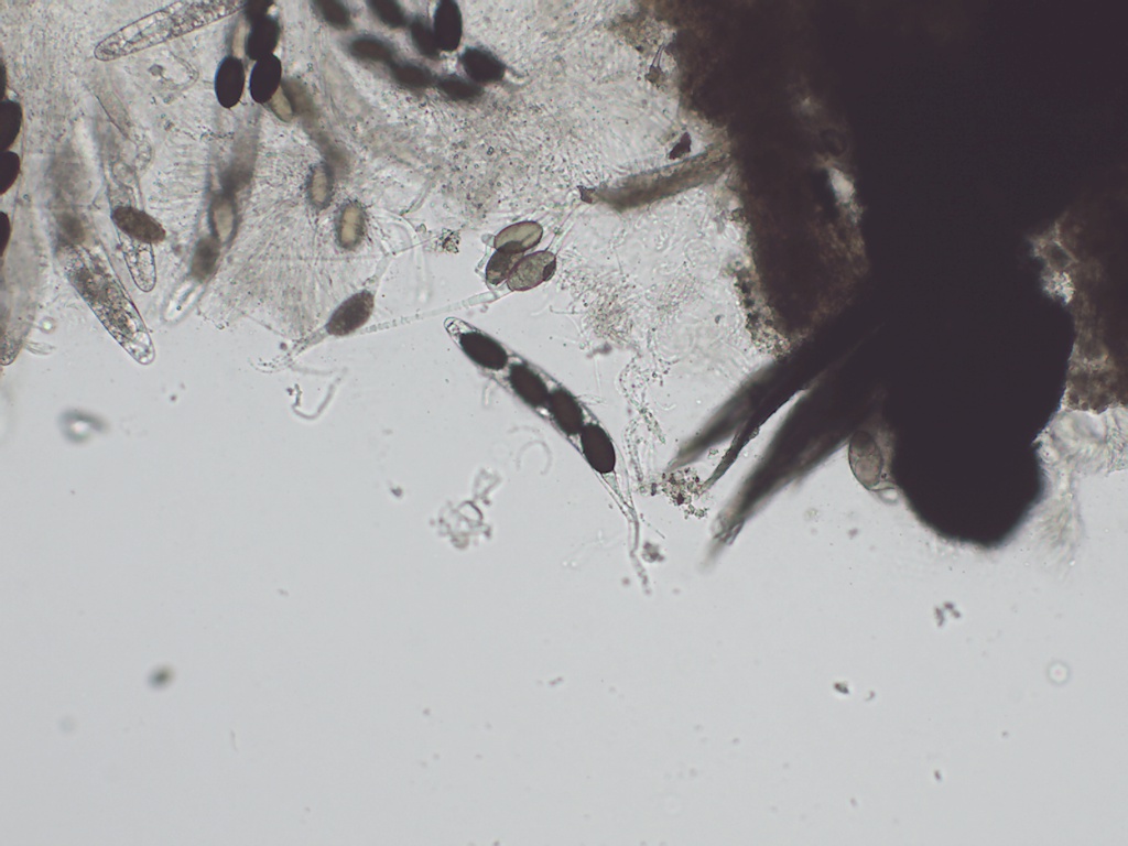 Die Sporen sind deutlich größer: 60,2-71,4 x 29,1-30,9µ und haben das auffällig unauffällige kleine Pedicell