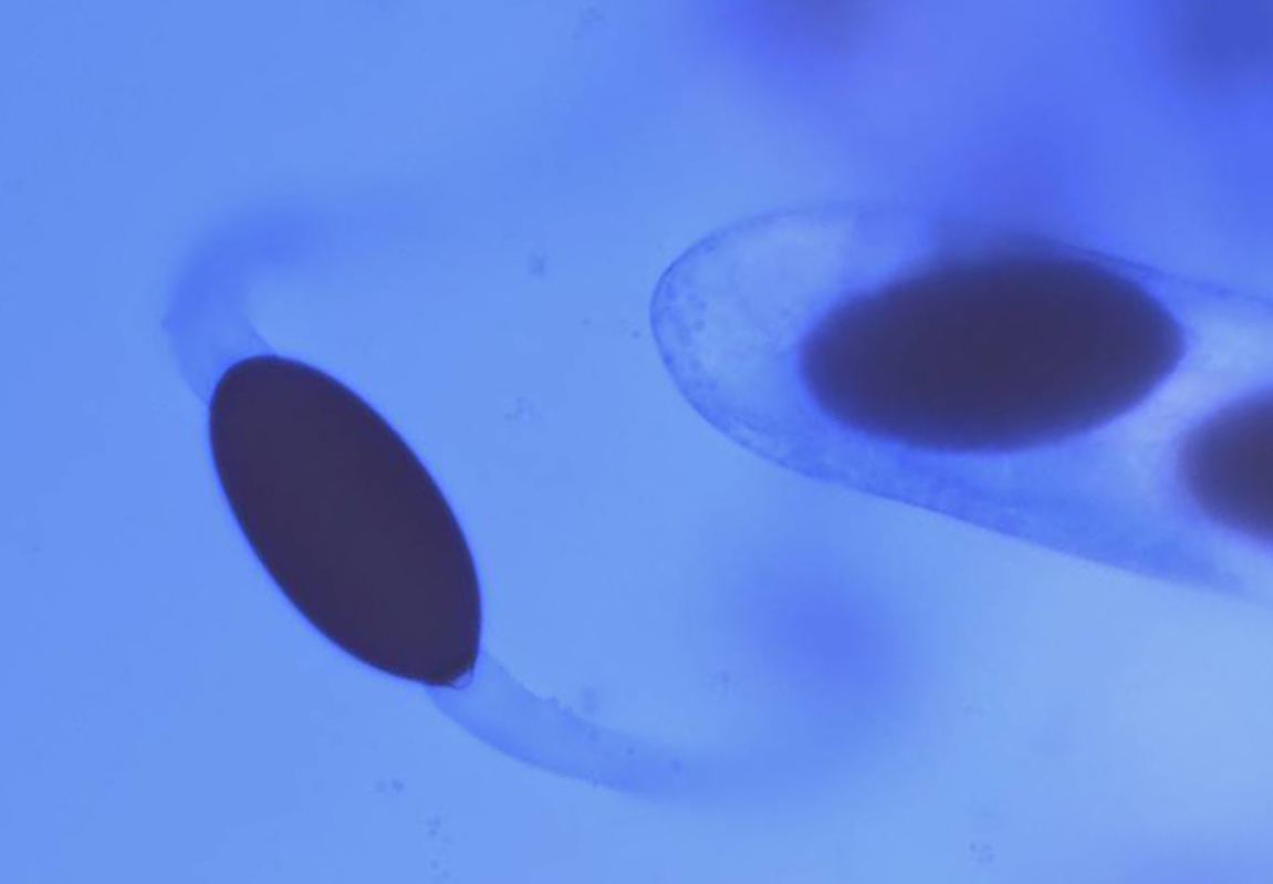 Die Sporen sind deutlich größer: 60,2-71,4 x 29,1-30,9µ und haben das auffällig unauffällige kleine Pedicell
