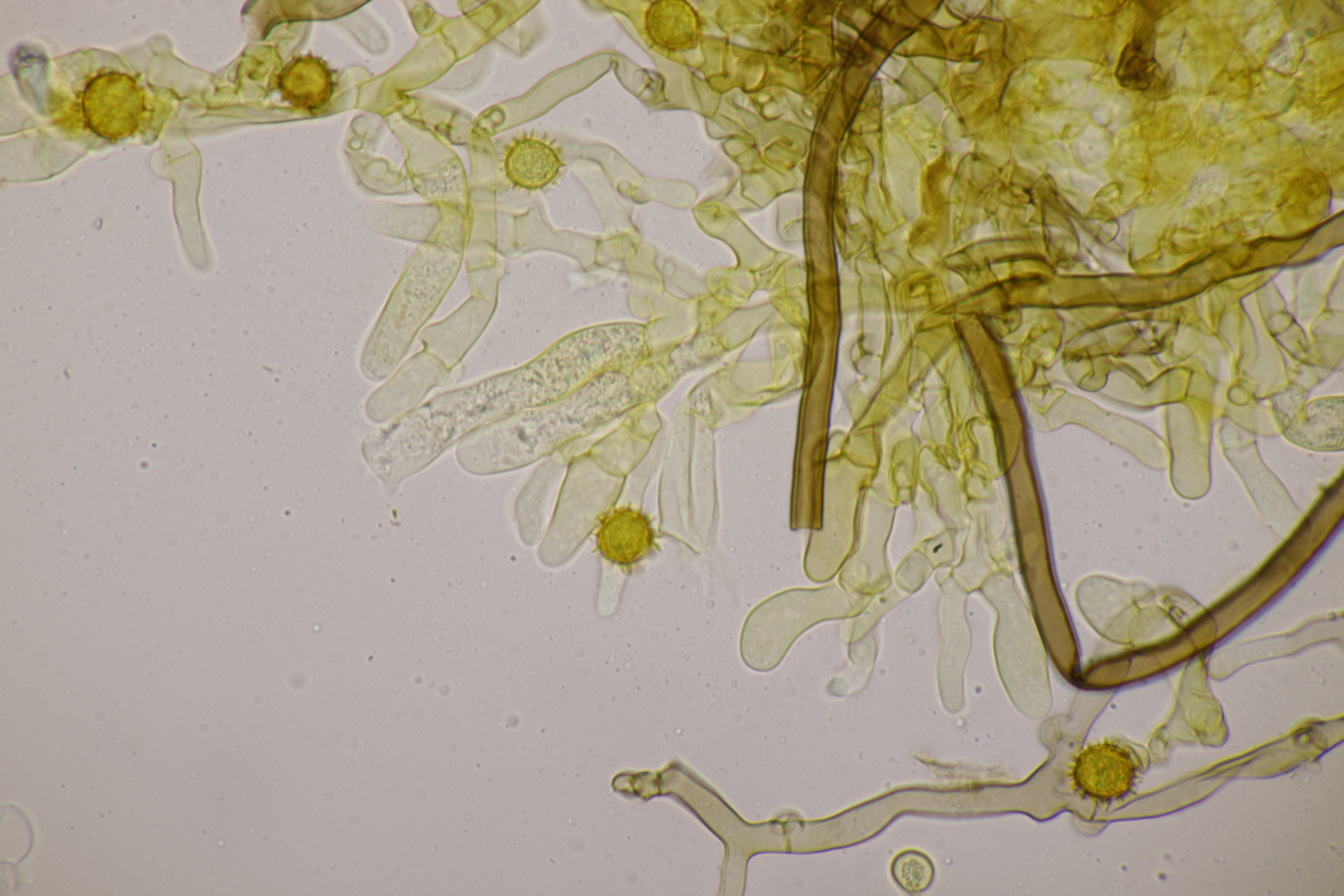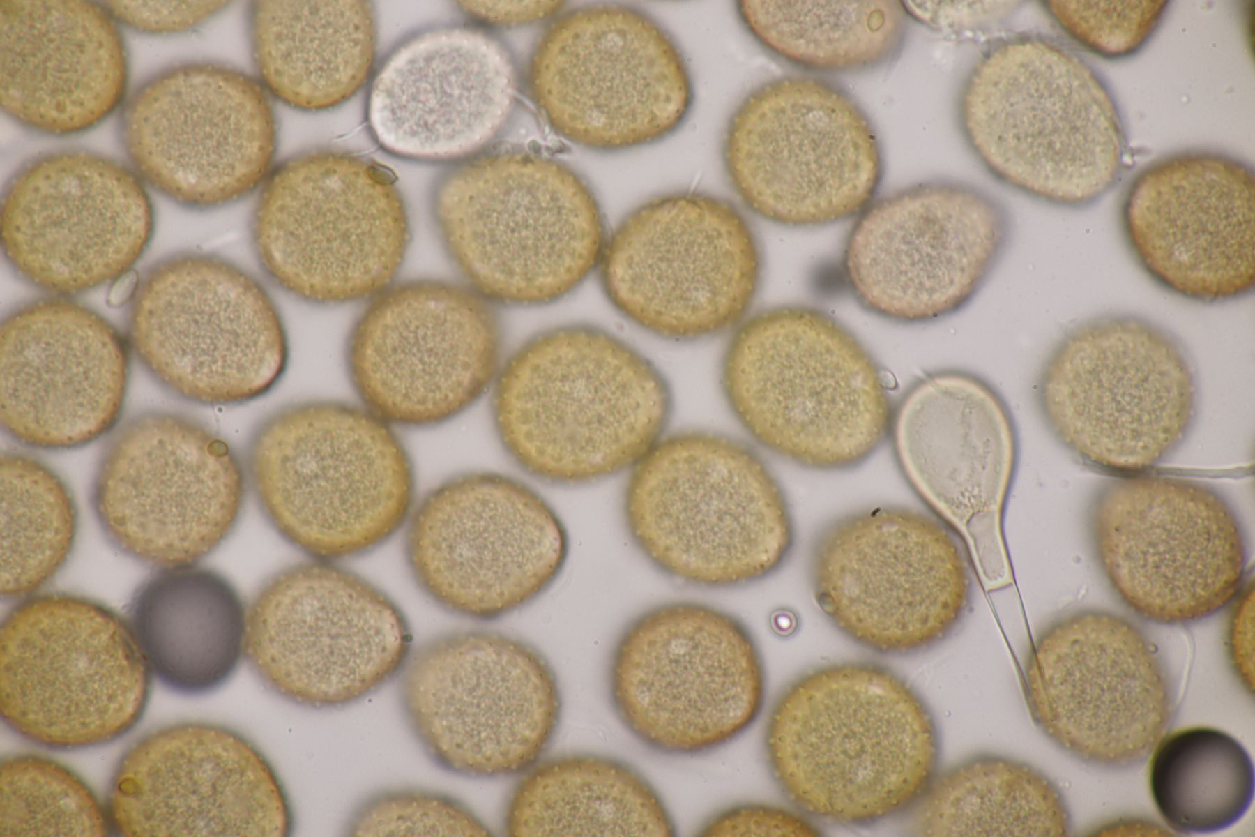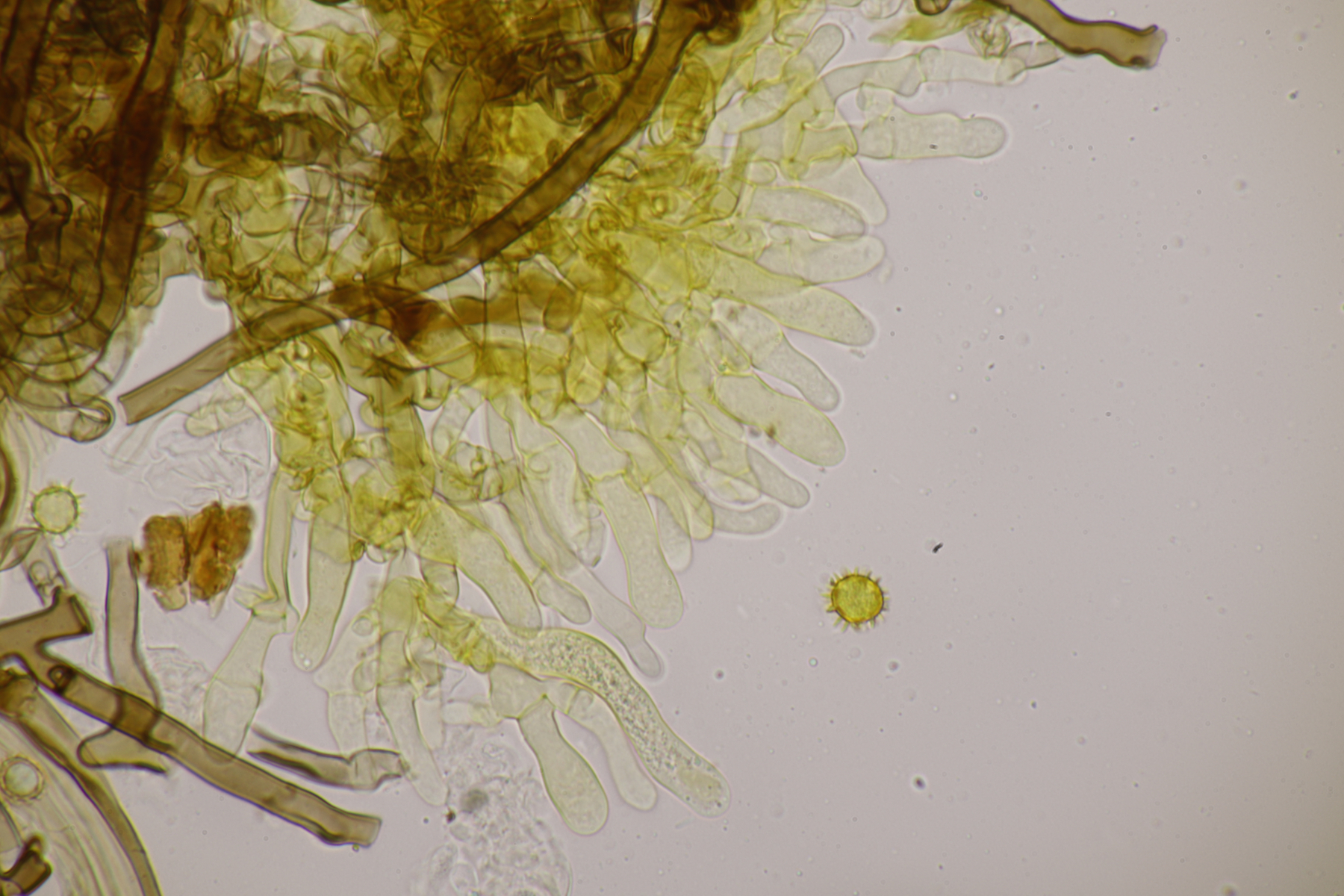 10. Hier haben wir im Feld gerätselt, was das für seltsame Stäublinge sein mögen. Mikroskopisch zeigte sich dann ein Capillitium ohne Poren und Septen, mit Paracapillitium untermischt, dazu praktisch glatte Sporen ohne Pedicel von 3,1-3,8 µm Durchmesser. Also Apioperdon pyriforme.