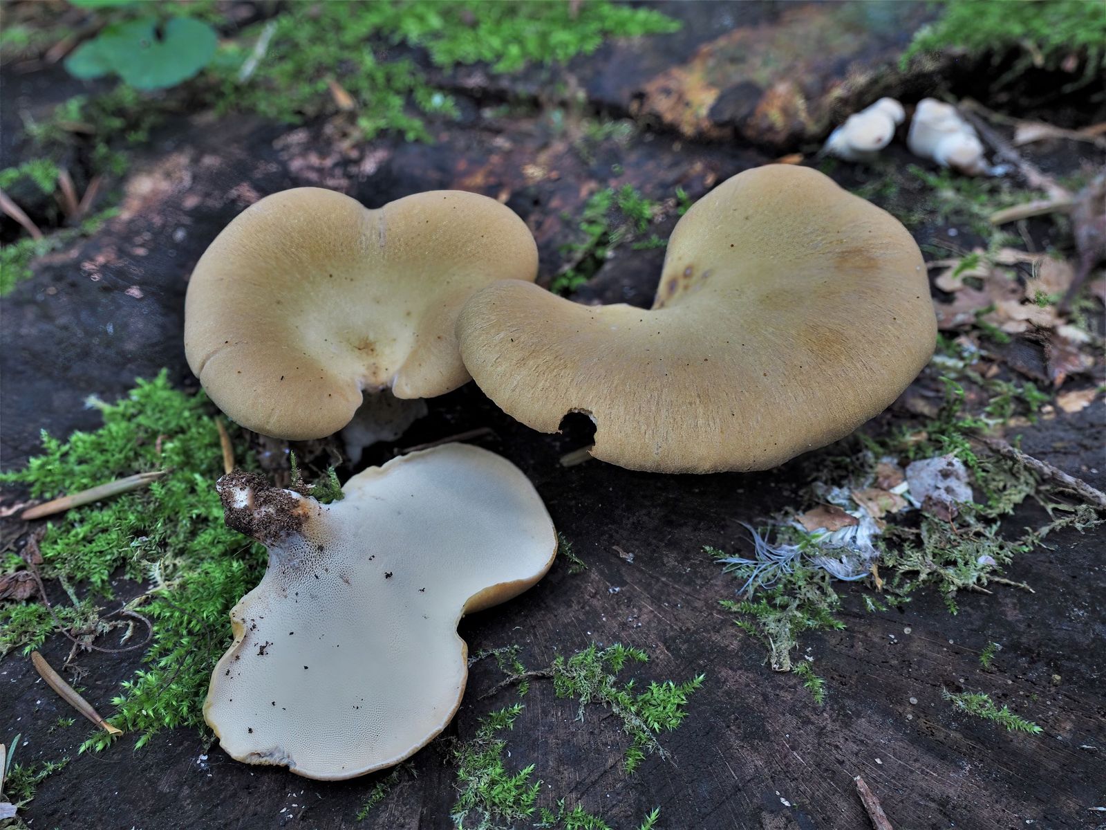 Die Hutoberfläche von Polyporus badius (ich belasse es mal bei der gängigen, ehemaligen Gattungszuordnung) ist speckig - glänzig. Die von Polyporus leptocephalus (= varius) dagegen matt und fein eingewachsen radialfaserig, eben so wie hier.