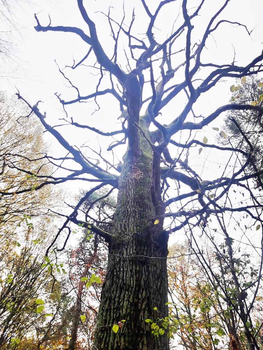 Diese alte Buche steht schon lange so im Wald, ganz oben sieht man ein paar Pilze, kann man aber nicht genau erkennen.