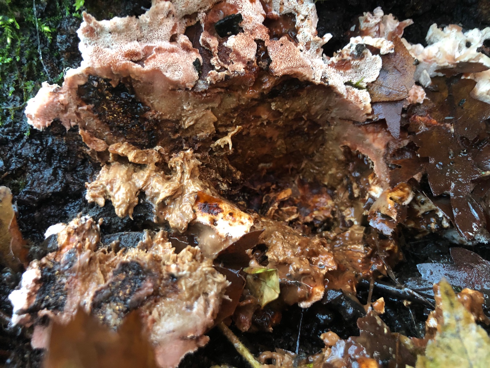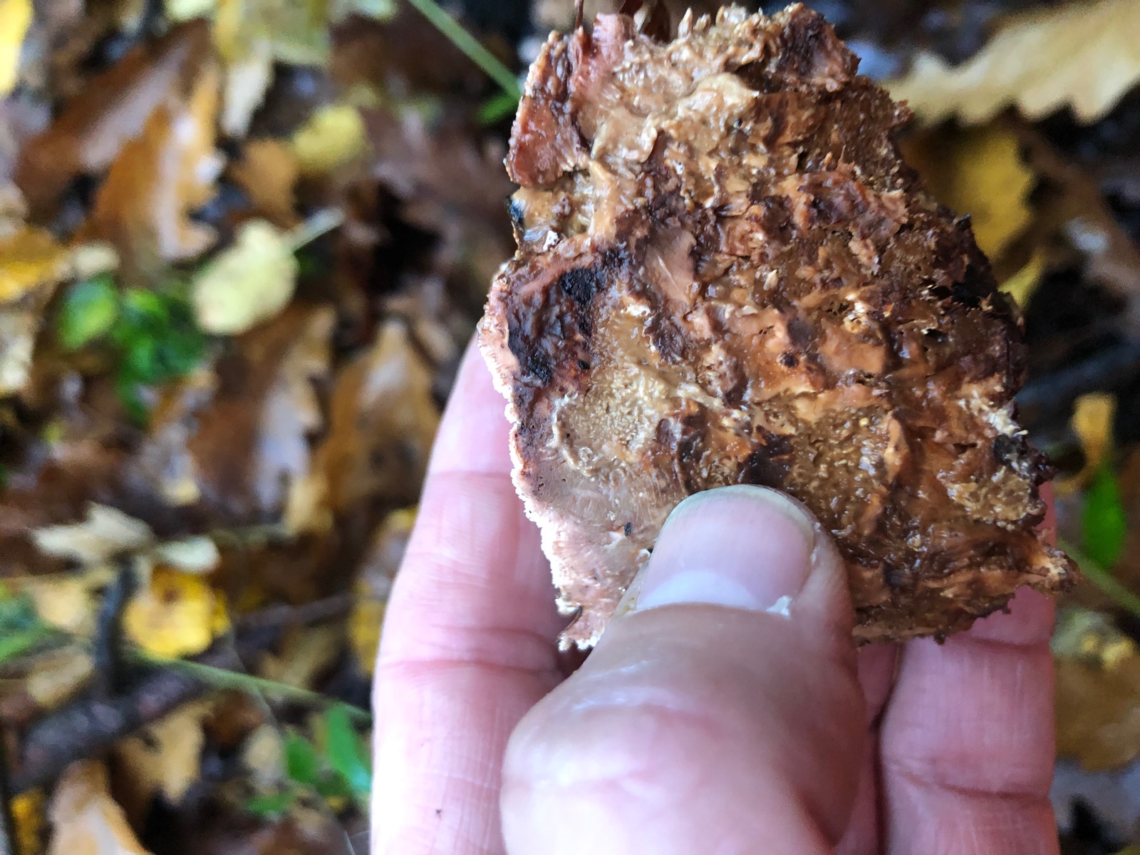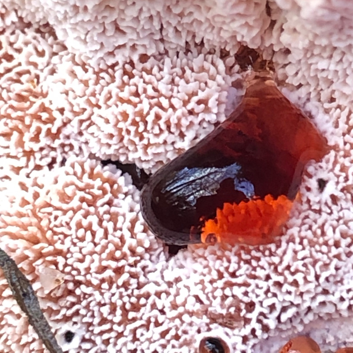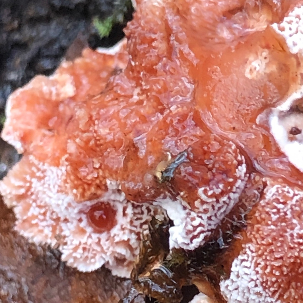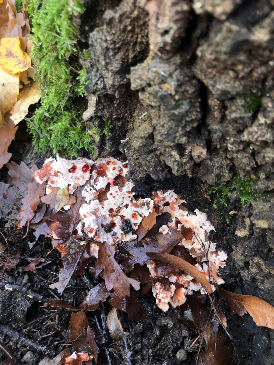 Blutender Korkstacheling würde von der Optik her passen, aber das Substrat stimmt irgendwie nicht, da es ja an Nadelholz vorkommt.