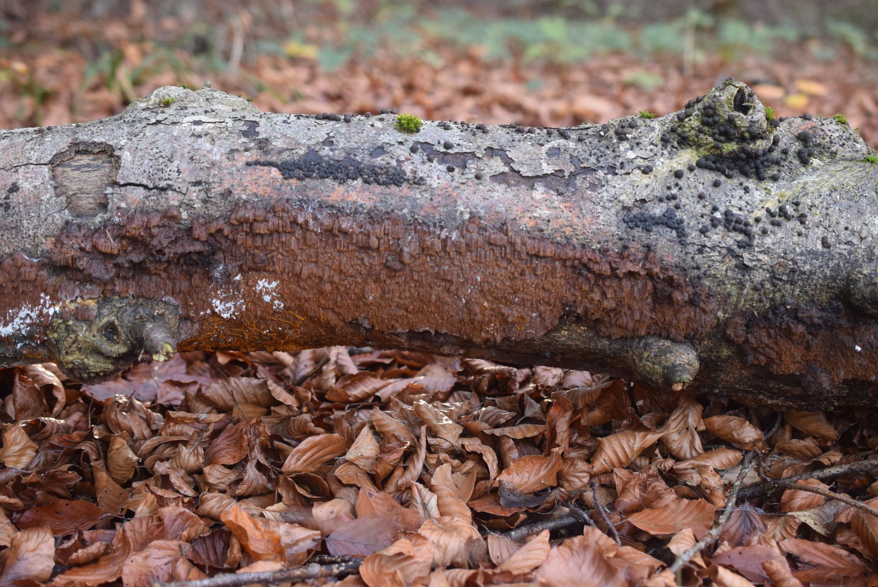 3. An Tote dicke Buchenast , so braune Farbe , Mumie oder ? Ich habe neben diese liegende Buchenast mehrere mall dieses Jahr vorbeigegangen und bis vorgestern kein Pilz auf dem Buchenast gesehen . Es sieht aus wie eine Alte Mumie