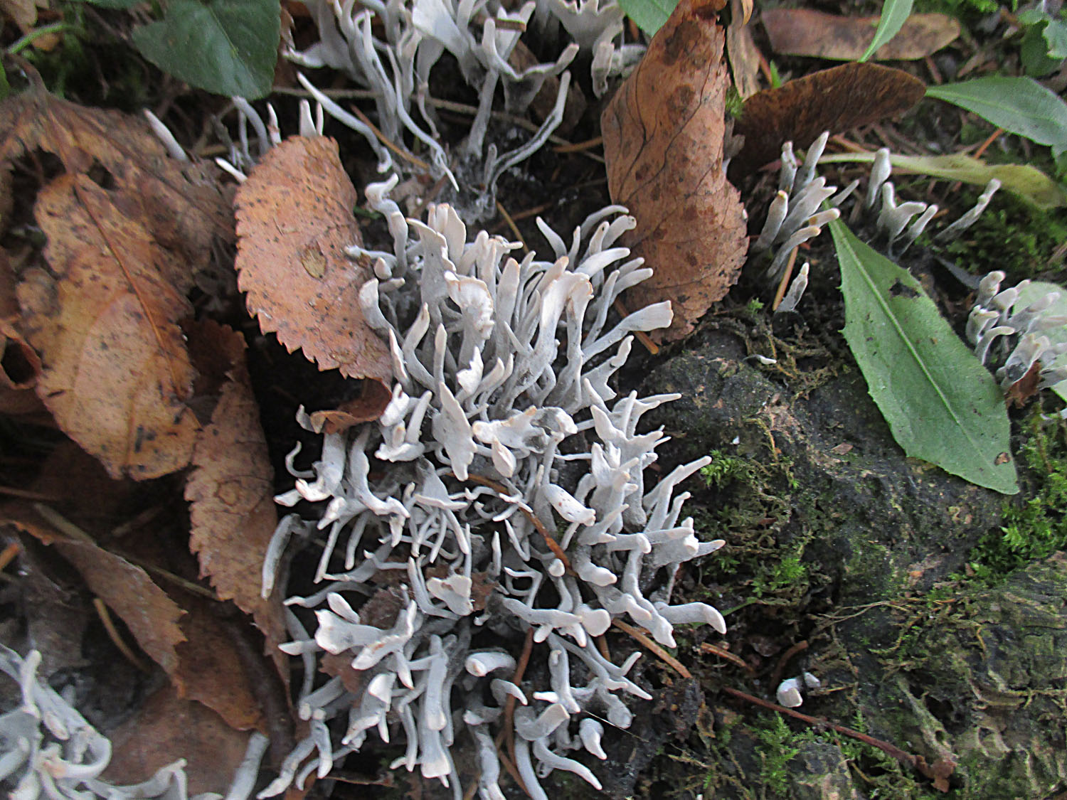 und eine einzelne Geweihförmige Wiesenkoralle (Clavulinopsis corniculata) zu sehen.