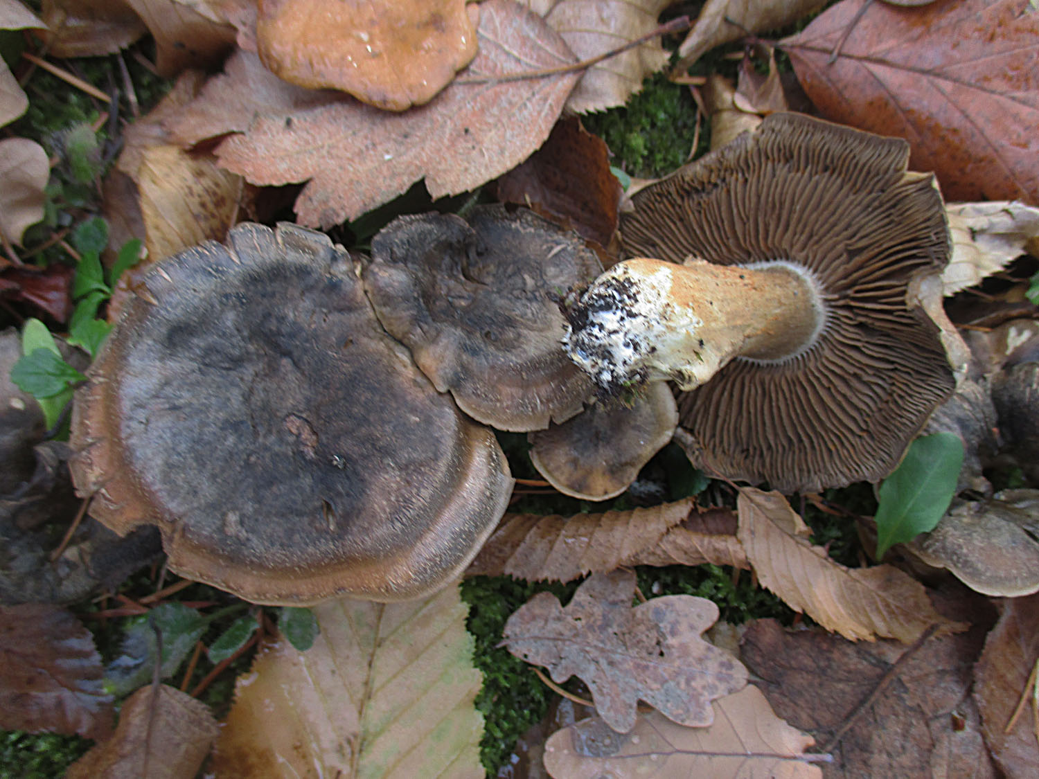 Meine Vermutung bei denen ist das Kuhmaul (Gomphidius glutinosus) aber nur wenn die so jung auch fast weiß sein dürfen. Einige mir unbekannte Schleierlinge (Cortinarius spec.)