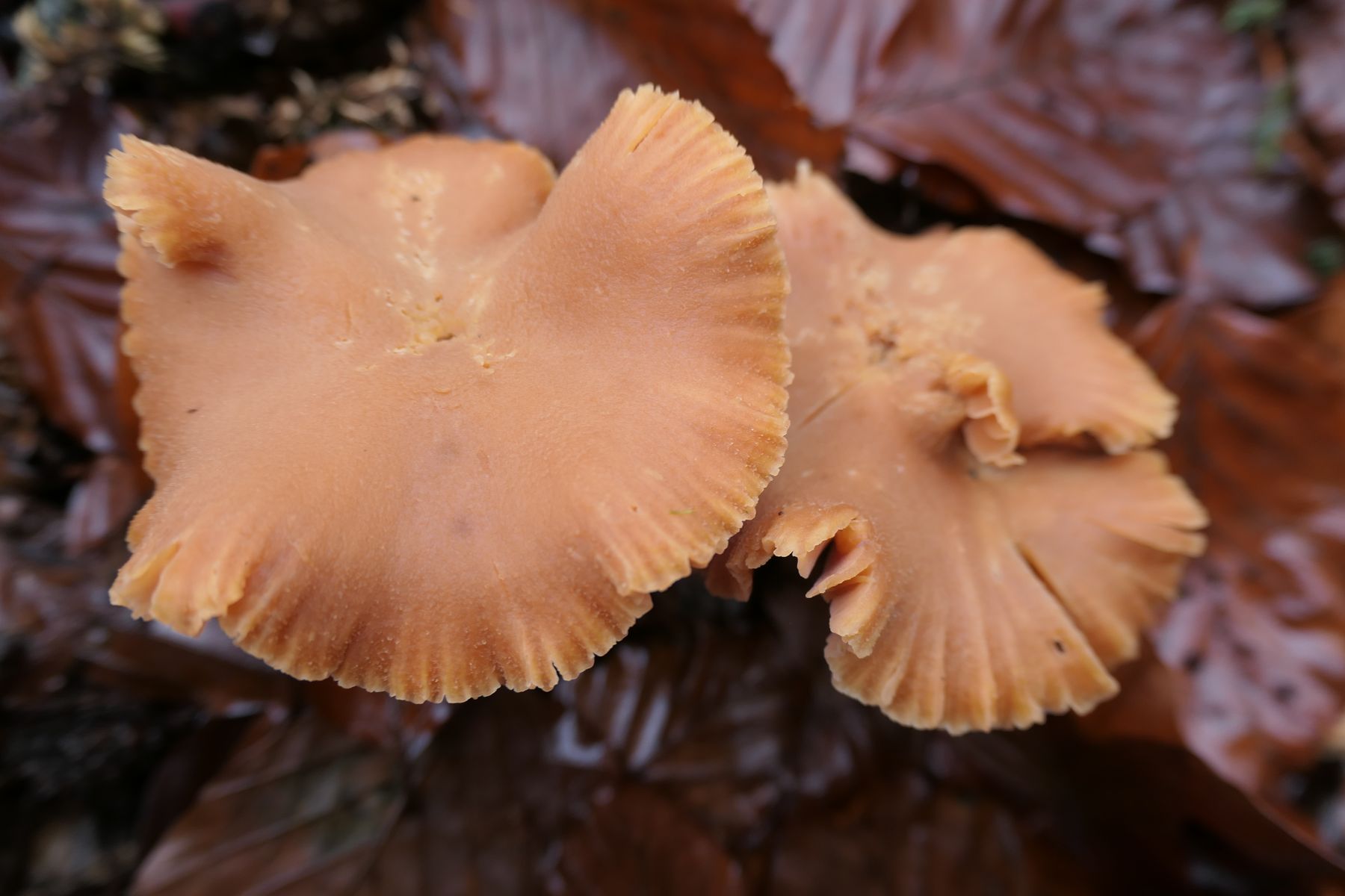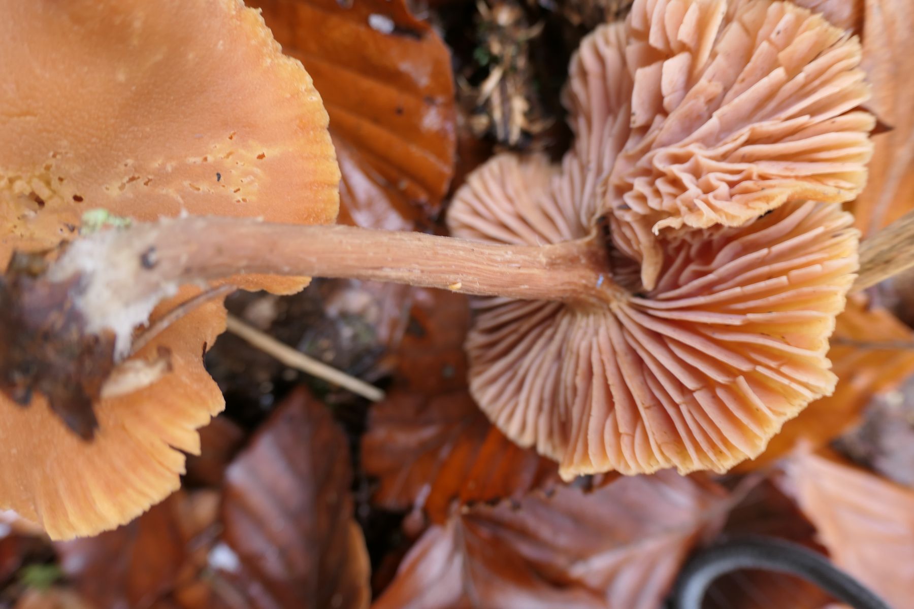 25.11.2022 am Rand eines Weges im Laubmischwald bei CH-Grenchen SO, ca 650 m, diesem wohl älteren Pilz mit krausem-welligem Rand begegnet;
