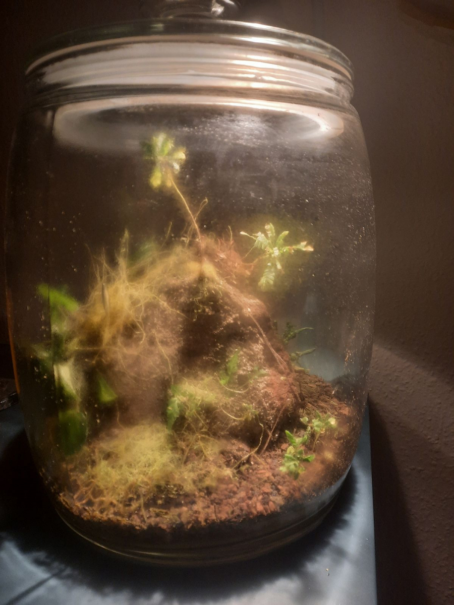 Mit dauerhaft geschlossenen bepflanzten Gläsern, sogenannten Hermetosphären habe ich recht viel Erfahrung. Super spannend wäre es wenn man ein Arangement treffen könnte zwischen geeigneten Pflanzen und einem Pilz, der dann ab und zu mal Fruchtkörper ausbildet, und in irgendeiner Art und Weise weiterlebt. Also entweder Sport oder als Myzel weiterlebt.
