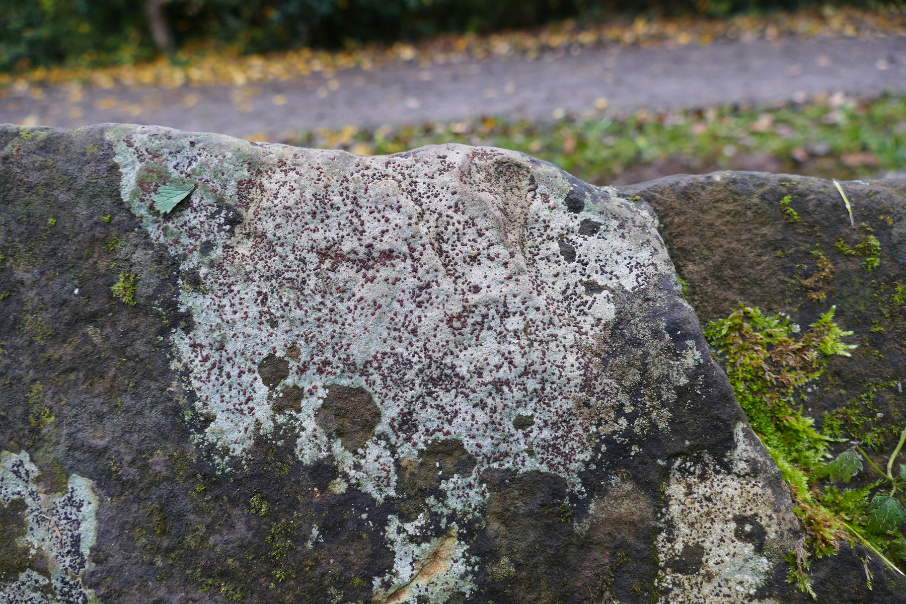Auf der Ostseite, zum Waldrand hin ausgerichtet, sind die Steine mit diesen Krustenflechten überzogen.