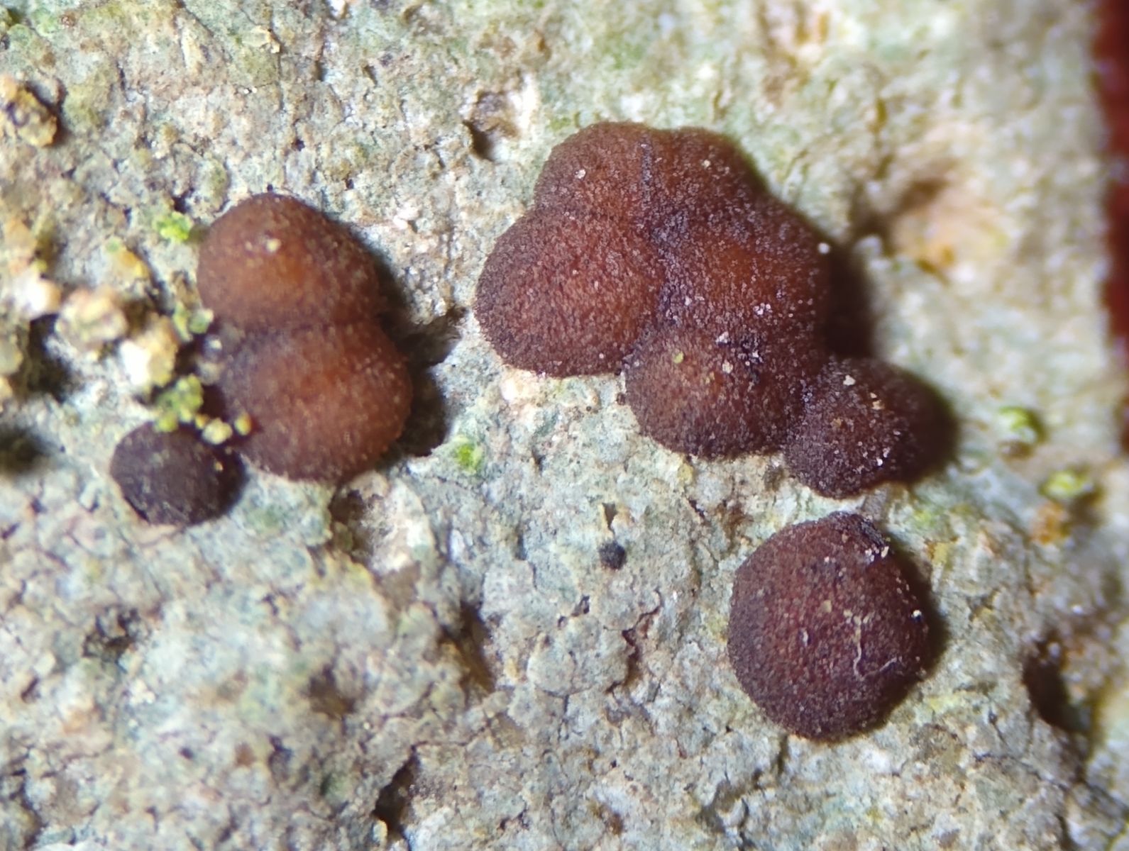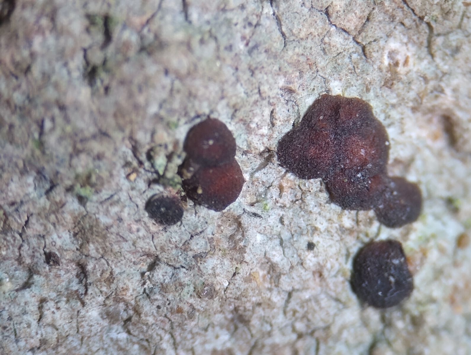 Die Apothecien sind zahlreich, geclustert, teilweise verwachsen, alt unberandet, trocken rotbraun, konvexe Oberflächen;
