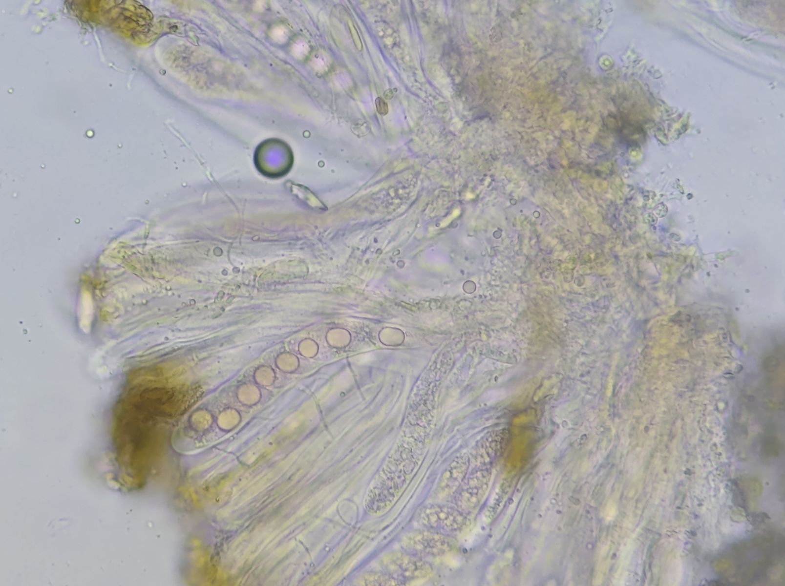 Sporen: zu 8 in in Asci, 1-zellig, breitelliptisch, große rosa Guttule, Sporenmaße 22-27 x 9-13, inamyloid