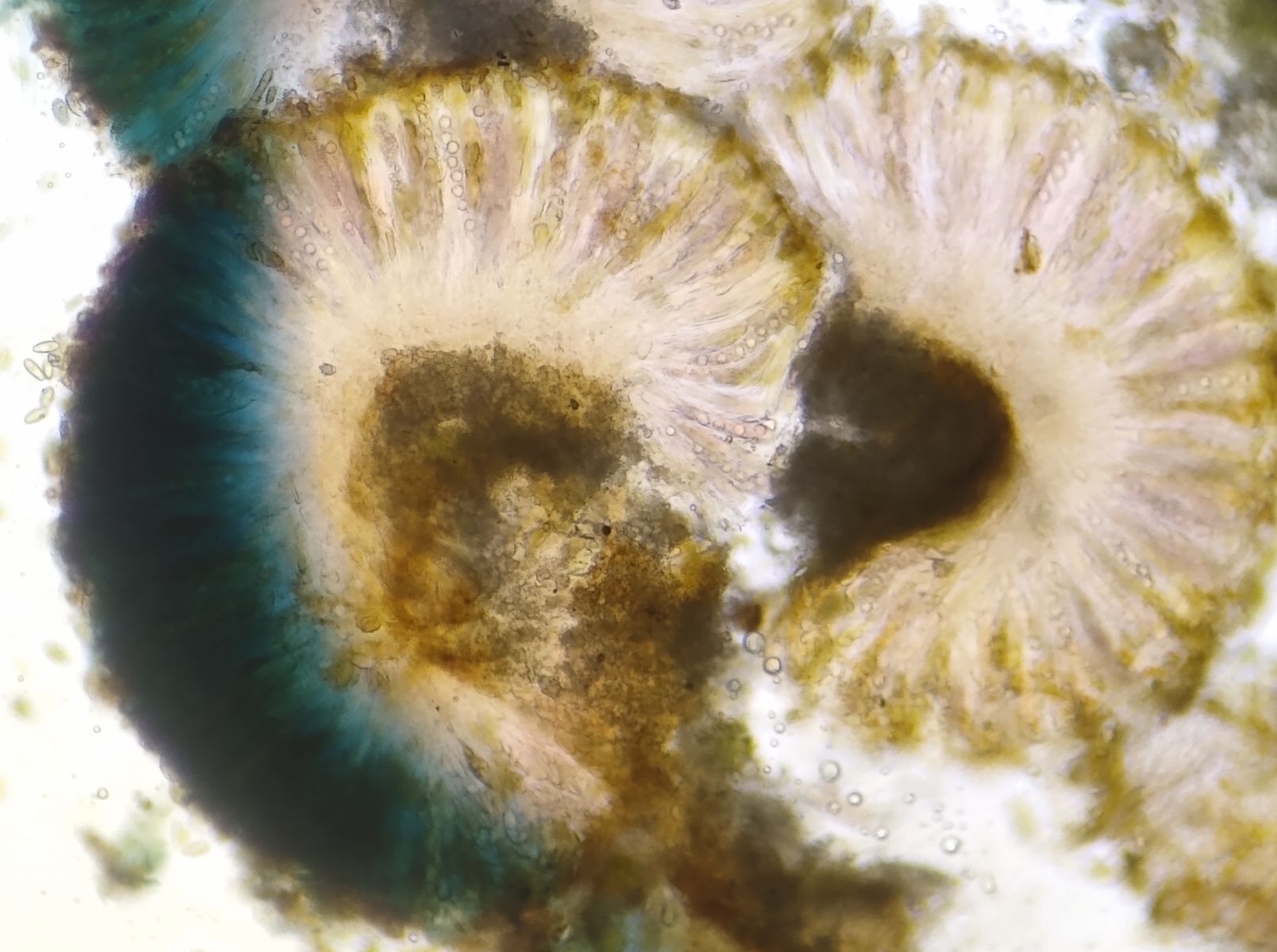Ob die riesigen rosa Guttulen in reife Trapelien-Sporen gehören, versuche ich nachher zu recherchieren.