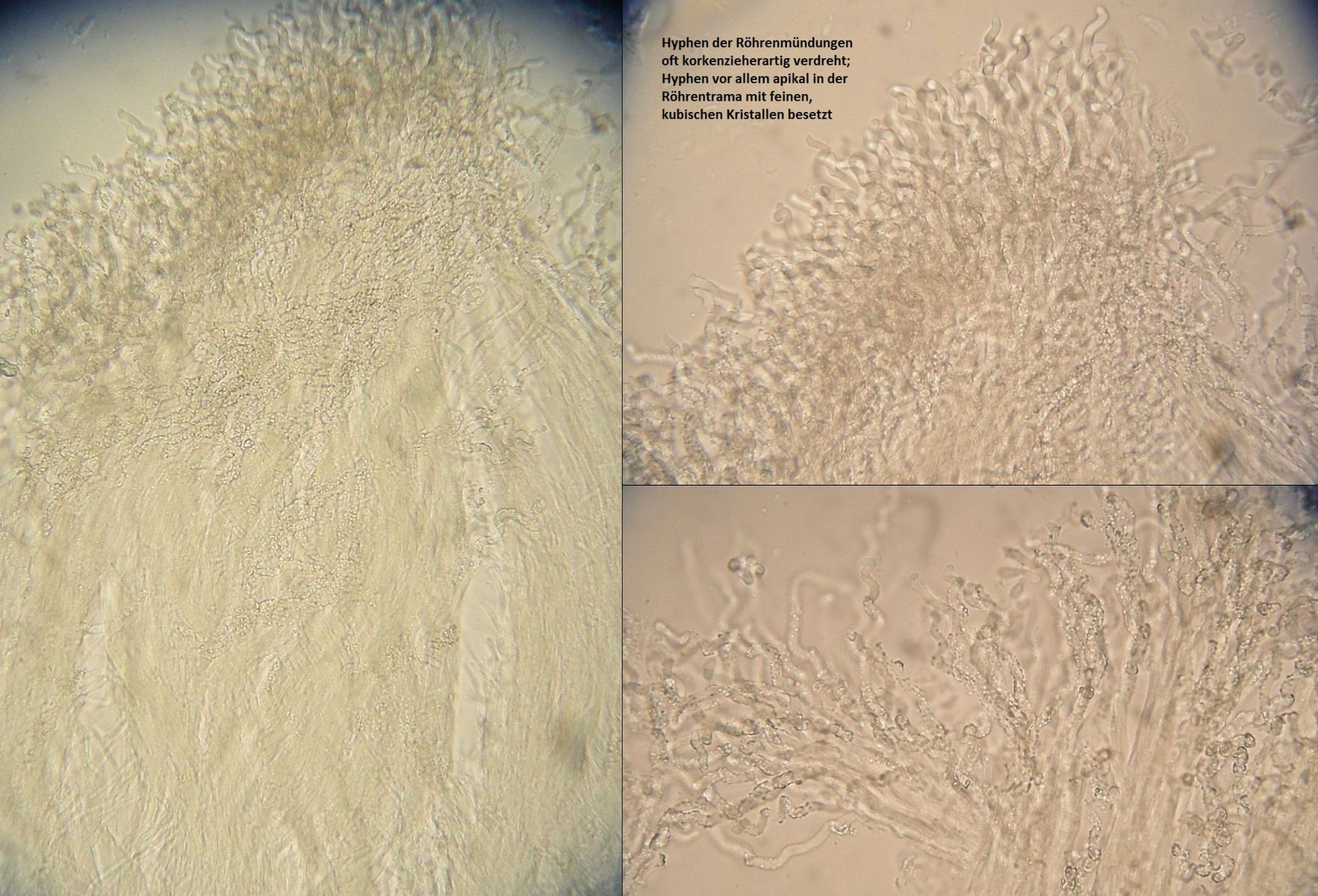 Man könnte auch anhand der Hyphen ein paar Dinge noch weiter eingrenzen, so findet man bei Skeletocutis (s.str.) zB in der Röhrentrama meistens "stachelig" inkrustierte Hyphen, die in der Form bei anderen Gattungen nicht vorkommen. Hier am Beispiel von Skeletocutis odora: