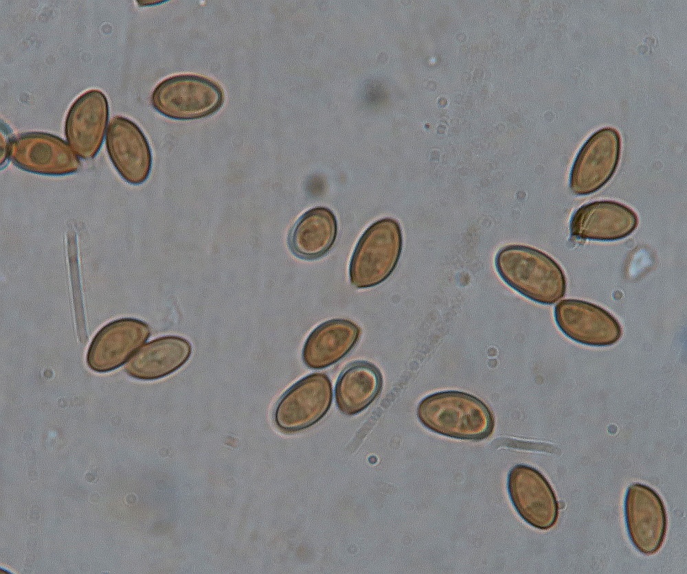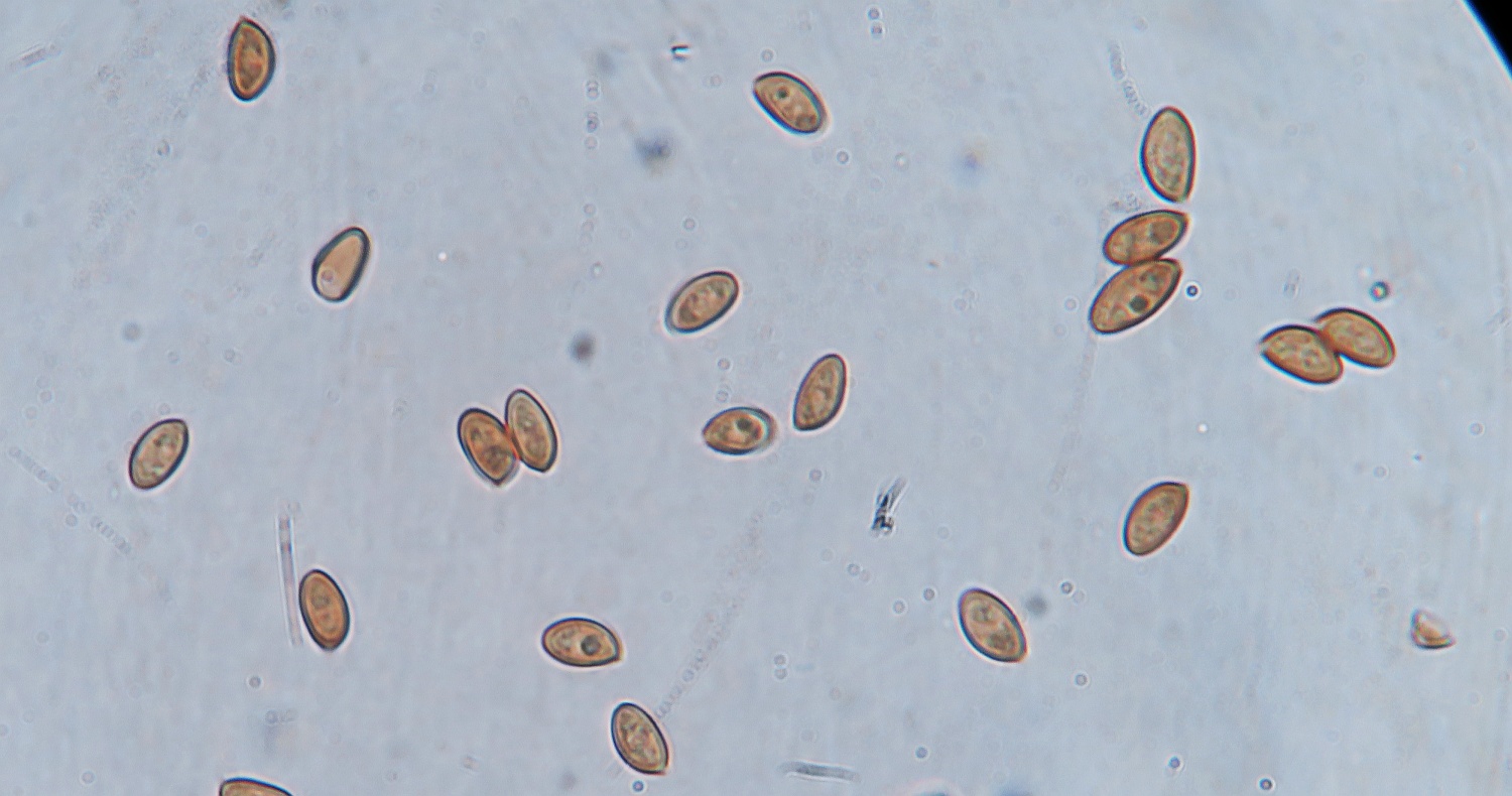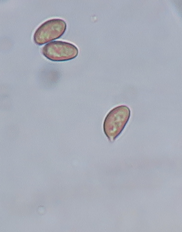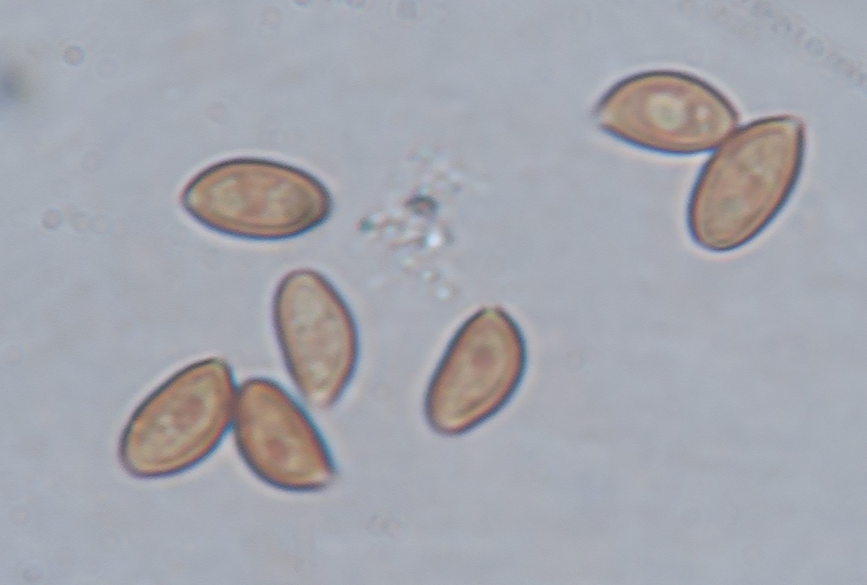 I have another Little Brown Mushroom with interesting colours , namely the stipe which is whitish outside with a yellowish flesh in the upper half and brownish at the bottom (when fresh). No ring, stipe glabrous except few scanty fibrils. I think the gills are in majority free (some maybe slightly touching at the uppermost part). Spore-print darkish rusty brown. The pileipellis is an hymenoderm of either spherical or spheropendiculate cells. Basidia frequent, 4-sporous oblong-clavate. Cheilocystidia appears to be numerous from the whitish edge, but when mounted, they were rather scarce. Their shape is lageniform-conical with gradual tapering towards the tip, 25-35um long. Spores ovate with a slight almond-shape, tiny germ pore at the base, wall seems thick, size: