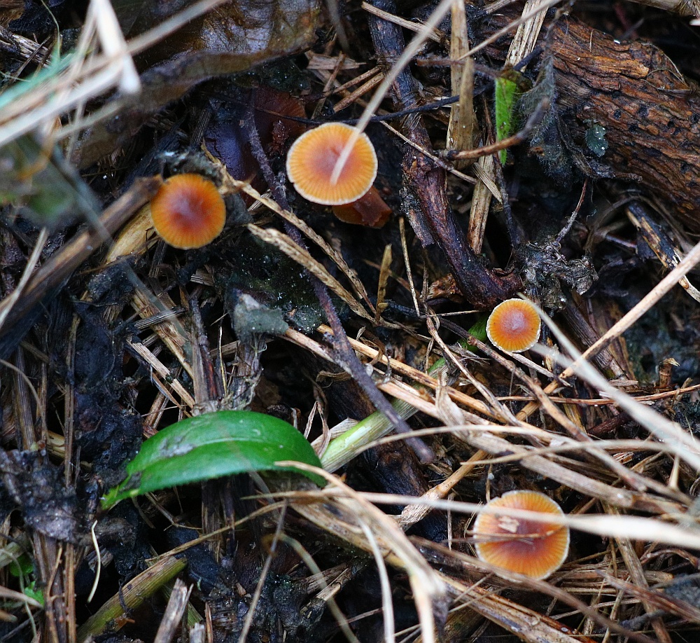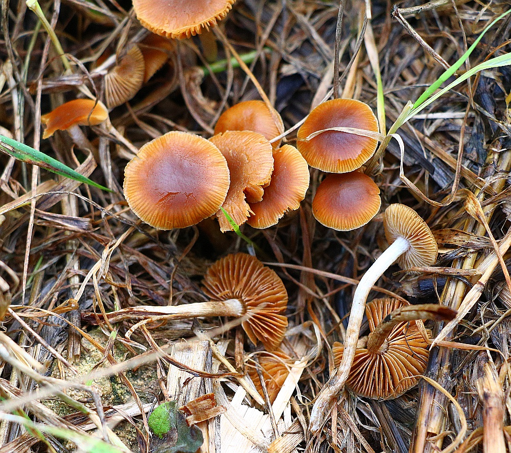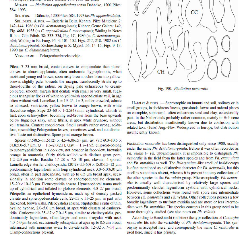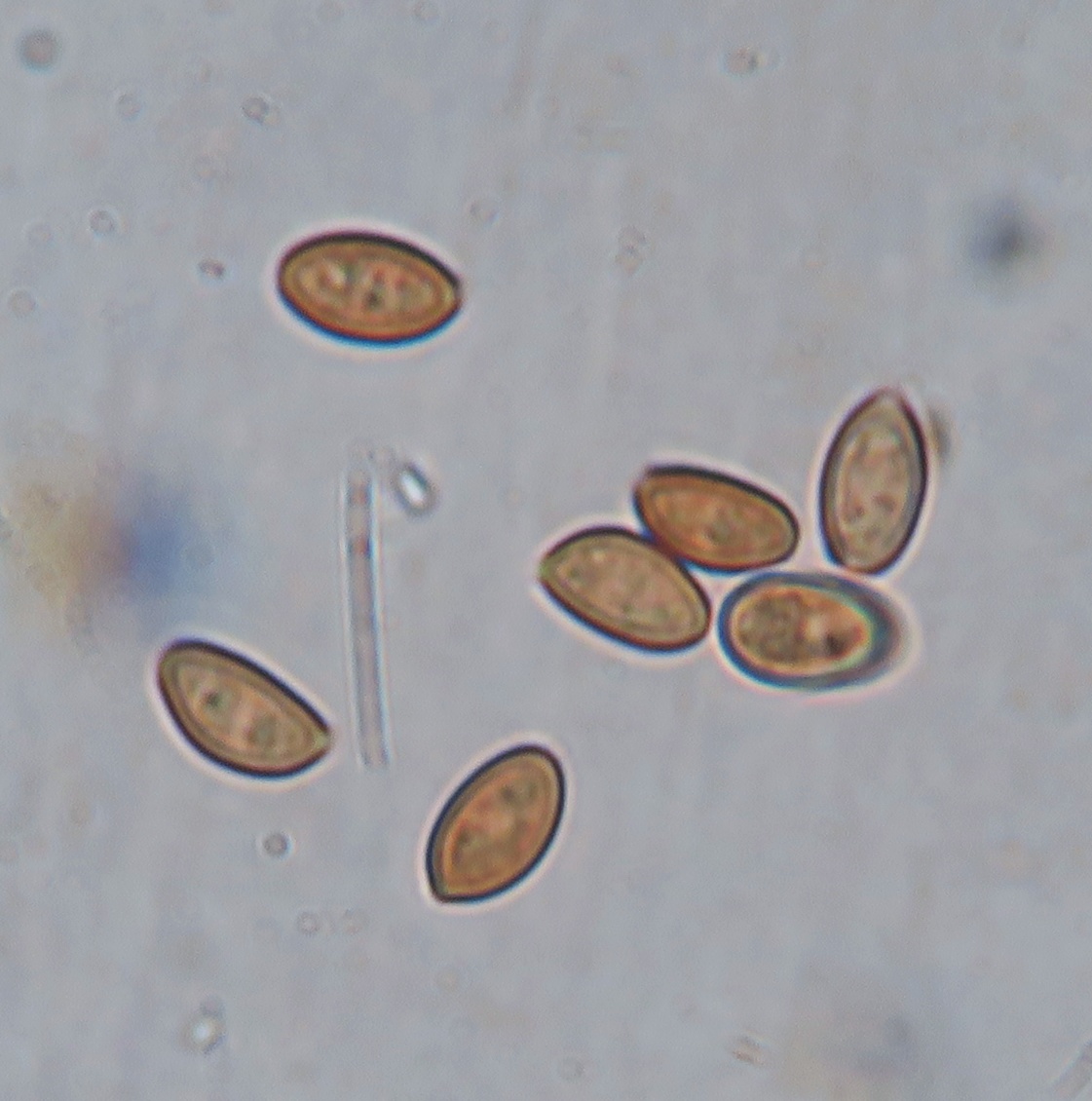 I have another Little Brown Mushroom with interesting colours , namely the stipe which is whitish outside with a yellowish flesh in the upper half and brownish at the bottom (when fresh). No ring, stipe glabrous except few scanty fibrils. I think the gills are in majority free (some maybe slightly touching at the uppermost part). Spore-print darkish rusty brown. The pileipellis is an hymenoderm of either spherical or spheropendiculate cells. Basidia frequent, 4-sporous oblong-clavate. Cheilocystidia appears to be numerous from the whitish edge, but when mounted, they were rather scarce. Their shape is lageniform-conical with gradual tapering towards the tip, 25-35um long. Spores ovate with a slight almond-shape, tiny germ pore at the base, wall seems thick, size: