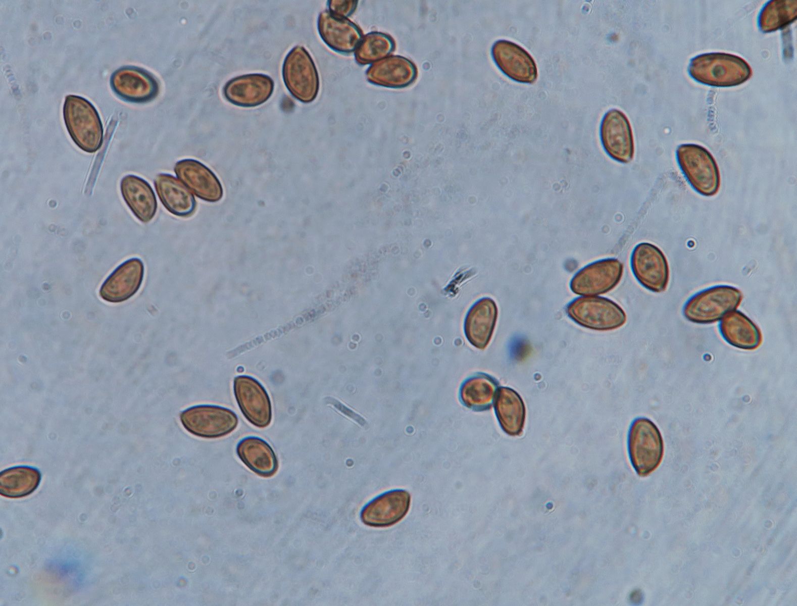 I have another Little Brown Mushroom with interesting colours , namely the stipe which is whitish outside with a yellowish flesh in the upper half and brownish at the bottom (when fresh). No ring, stipe glabrous except few scanty fibrils. I think the gills are in majority free (some maybe slightly touching at the uppermost part). Spore-print darkish rusty brown. The pileipellis is an hymenoderm of either spherical or spheropendiculate cells. Basidia frequent, 4-sporous oblong-clavate. Cheilocystidia appears to be numerous from the whitish edge, but when mounted, they were rather scarce. Their shape is lageniform-conical with gradual tapering towards the tip, 25-35um long. Spores ovate with a slight almond-shape, tiny germ pore at the base, wall seems thick, size: