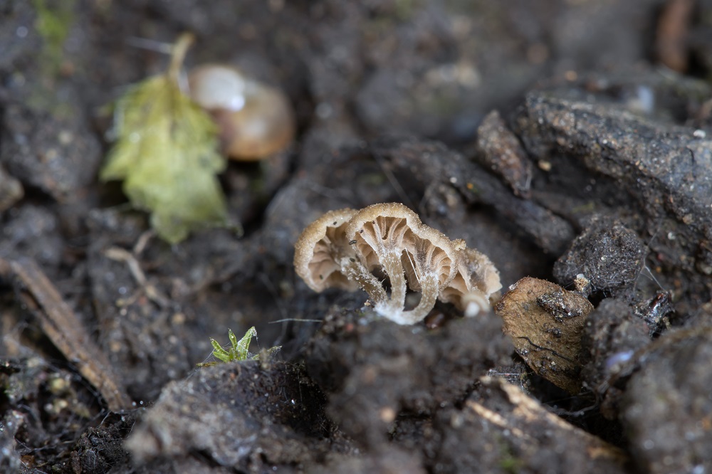 ja, das ist ein atemberaubender Fund! Ich denke, ich hätte diesen Pilz alleine wohl nie entdeckt und bin sehr froh drüber, dass Thorben mir den gezeigt hat und er zu der Zeit überhaupt wuchs. Man sieht ganz gut, dass der Pilz direkt auf dem "Hang" dieser Beetkante wuchs und erst nach mehrmaligen genauen hinschauen, entpuppten sich diese kleinen braunen Punkte mit etwas dunkleren Mitte als Pilz und sogar als solche mit Lamellen.