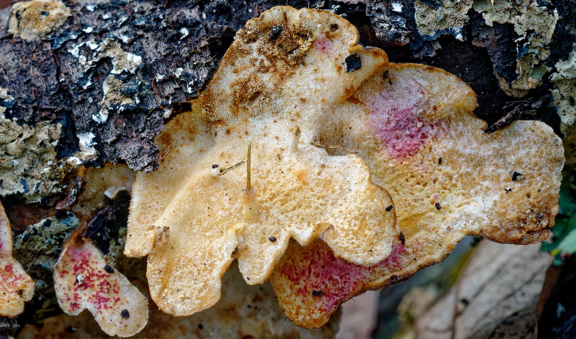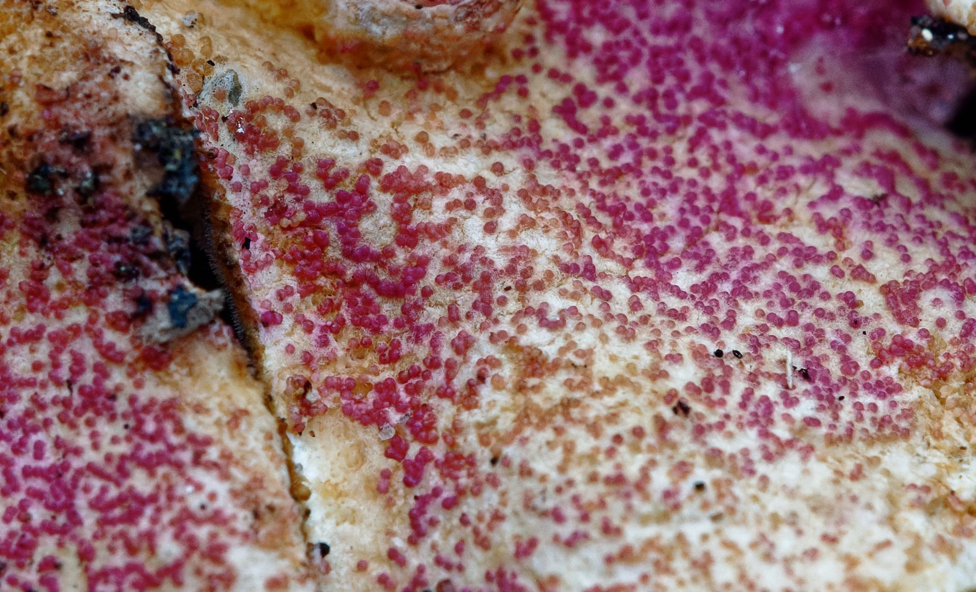 • Vielen Dank Ulla und Chris. Beide Arten, so habe ich inzwischen herausgefunden, gehören zur Familie der Hypocreaceae, die roten Kügelchen sind Fruchtkörper (Apocarp), hier speziell Perithecien. Hypomyces rosellus soll nur rote Perithecien ausbilden (habe die Informationsquelle leider nicht parat) . Sollte dies zutreffen, so würde H. rosellus nicht passen, da ich auch andersfarbige Perithecien sehe.
