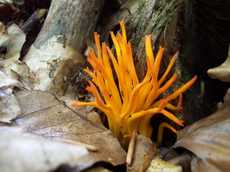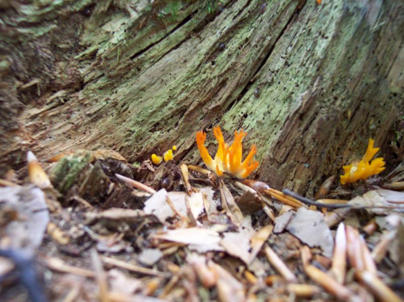 Wir haben ab und zu diesen orange-gelben Pilz gefunden. Nando hatte schon vermutet (oder wusste er es?), dass es der Klebrige Hörnling ist. Ich war etwas skeptisch wegen der Farben. Beim zweiten waren wir uns beide unsicher wegen der hellen Basis. Ich habe noch mal nachgeschaut; bei Trockenheit soll er mehr orangerote Töne annehmen. Demnach ist er es also.