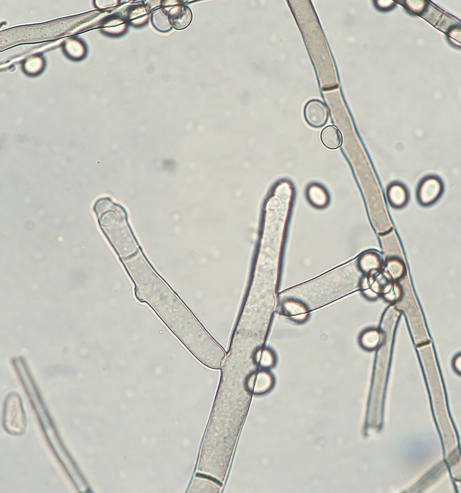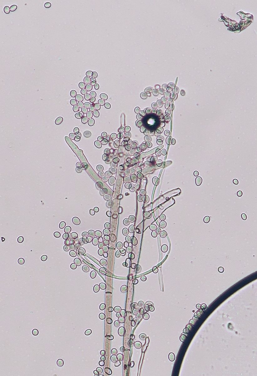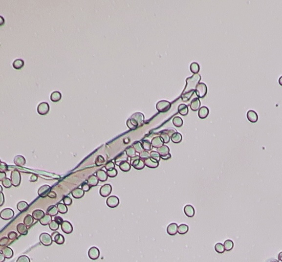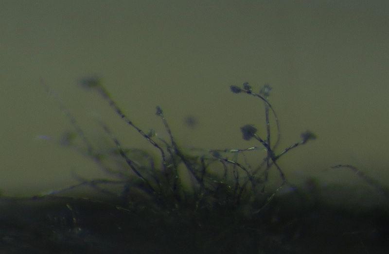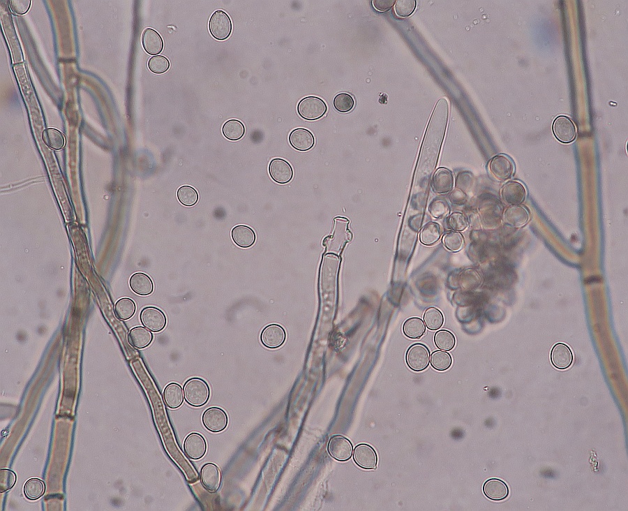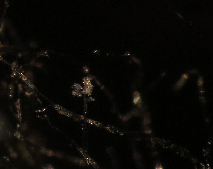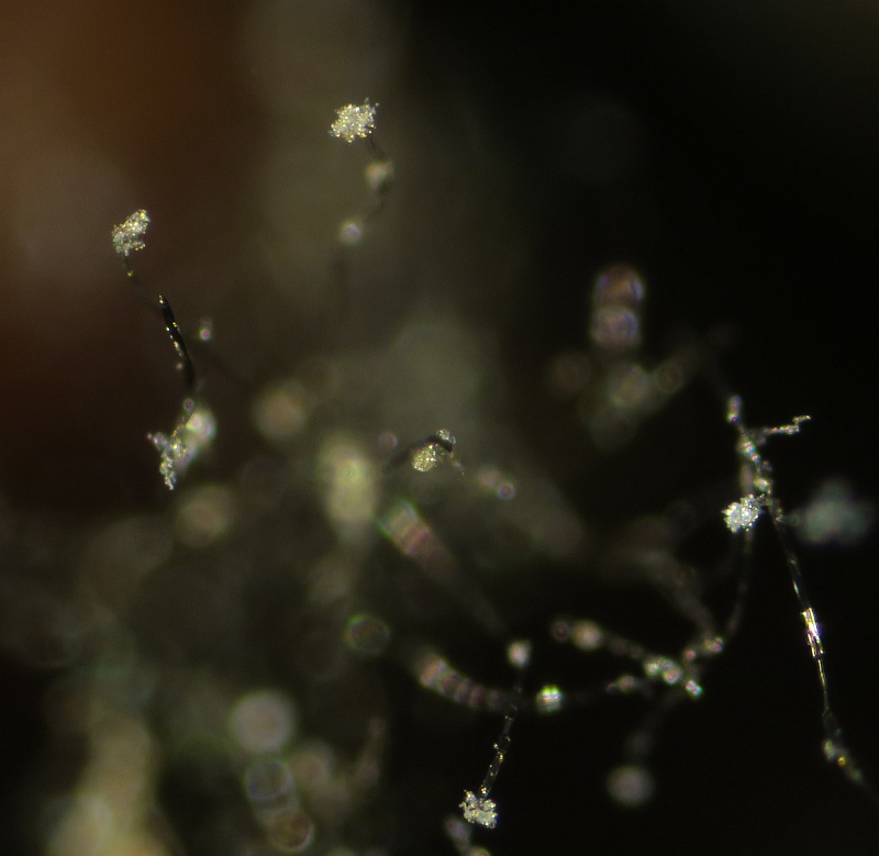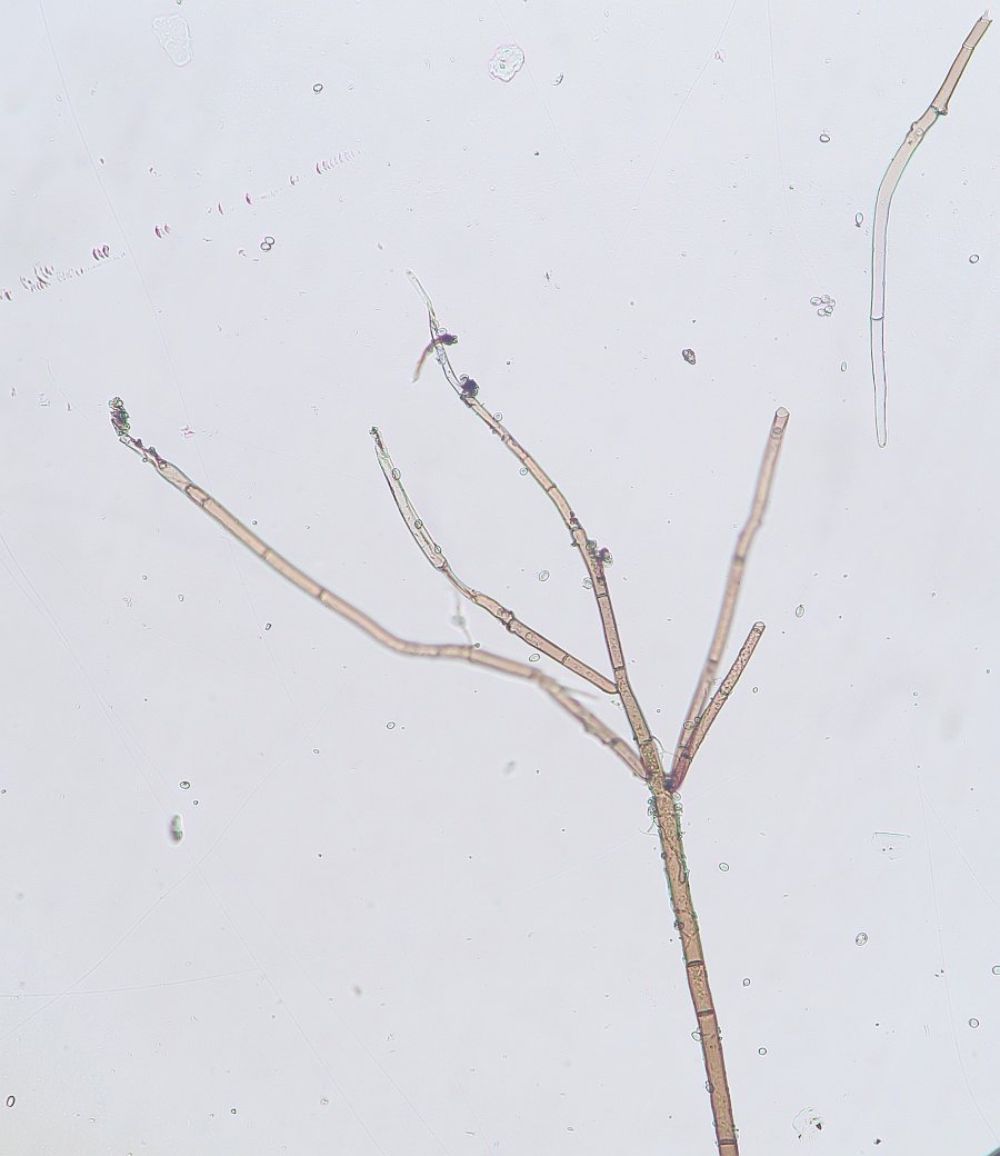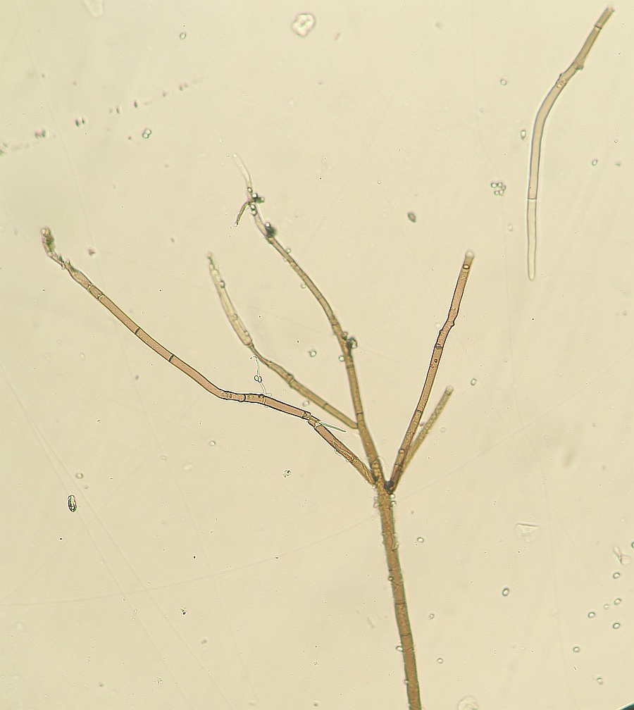Growing on the pulp of a fallen fruit of Hawthorn (Crataegus monogyna) was a dark mycelium with white heads which took my curiosity to investigate. Under the microscope I could see a simple, dark-coloured (blackish-brown) septate conidiophore (somewhat paler at the tips or undeveloped ones) with a small head-like cluster of hyaline-white conidiospores. These are liberated readily in water or soap water, so I suspect that there is some slime involved. However, at the location where the conidia are present are 3-6 small, flattened plugs projecting out onto which clusters of spores are attached. The spores are subglobose to oval, variable size, possible not hyaline but opaque since spore contents (eg oil bodies) are not seen.