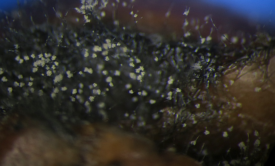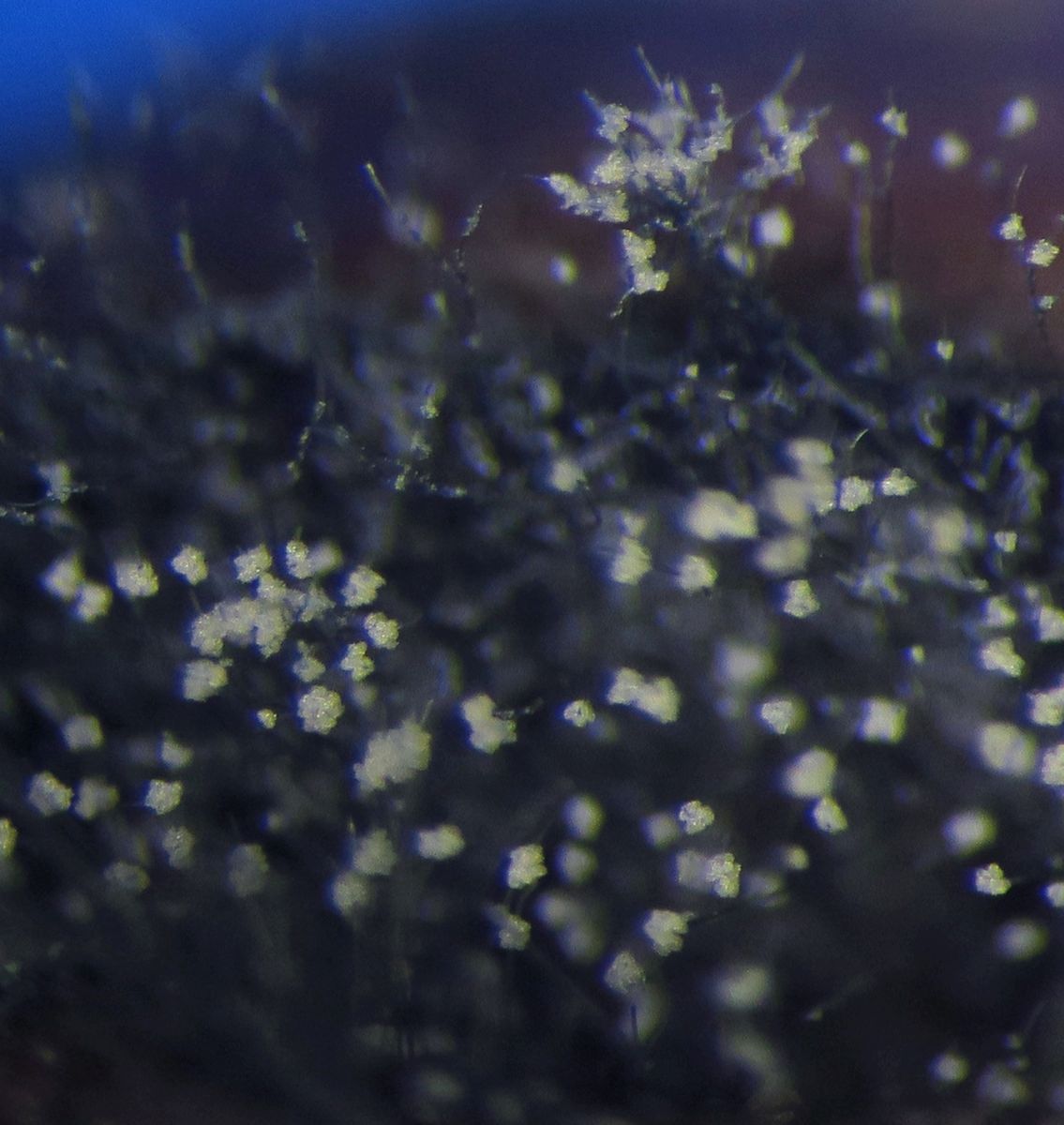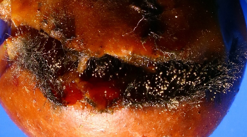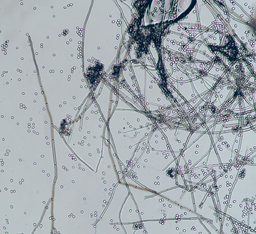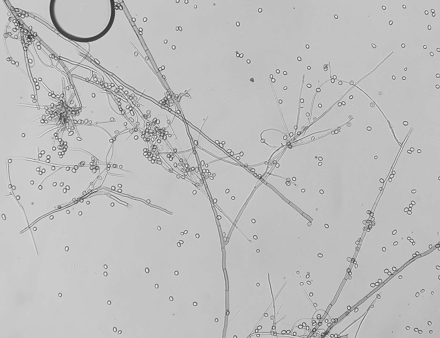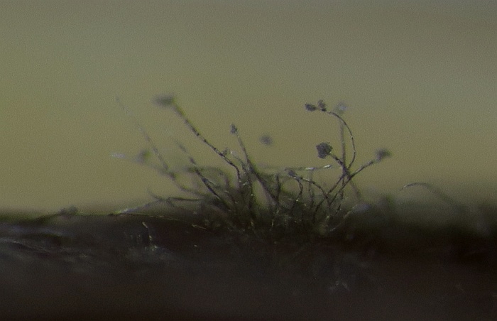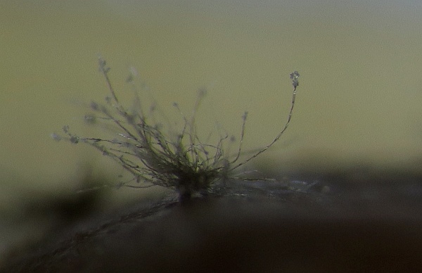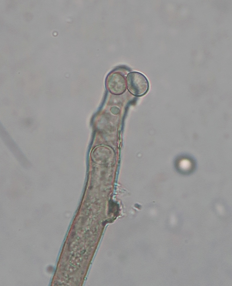 Growing on the pulp of a fallen fruit of Hawthorn (Crataegus monogyna) was a dark mycelium with white heads which took my curiosity to investigate. Under the microscope I could see a simple, dark-coloured (blackish-brown) septate conidiophore (somewhat paler at the tips or undeveloped ones) with a small head-like cluster of hyaline-white conidiospores. These are liberated readily in water or soap water, so I suspect that there is some slime involved. However, at the location where the conidia are present are 3-6 small, flattened plugs projecting out onto which clusters of spores are attached. The spores are subglobose to oval, variable size, possible not hyaline but opaque since spore contents (eg oil bodies) are not seen.