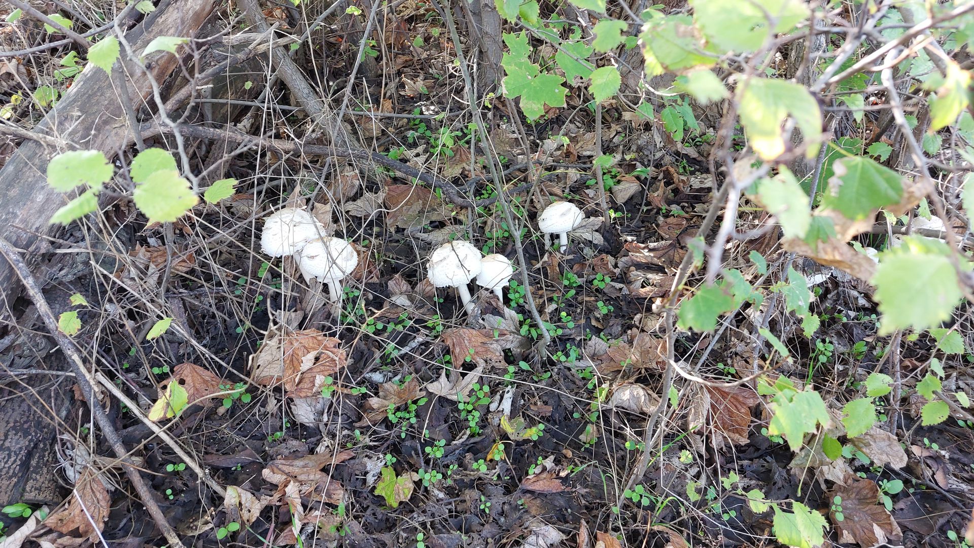 In einem Gebüsch mit Ahorn-Baum habe ich die Ansammlung der FK gefunden. Auf der einen Seite des Feldweges das Gebüsch zur Autobahn hin, auf der anderen Seite ein Acker. Es werden in diesem Bereich immer wieder kompostierbare Grünabfälle entsorgt.