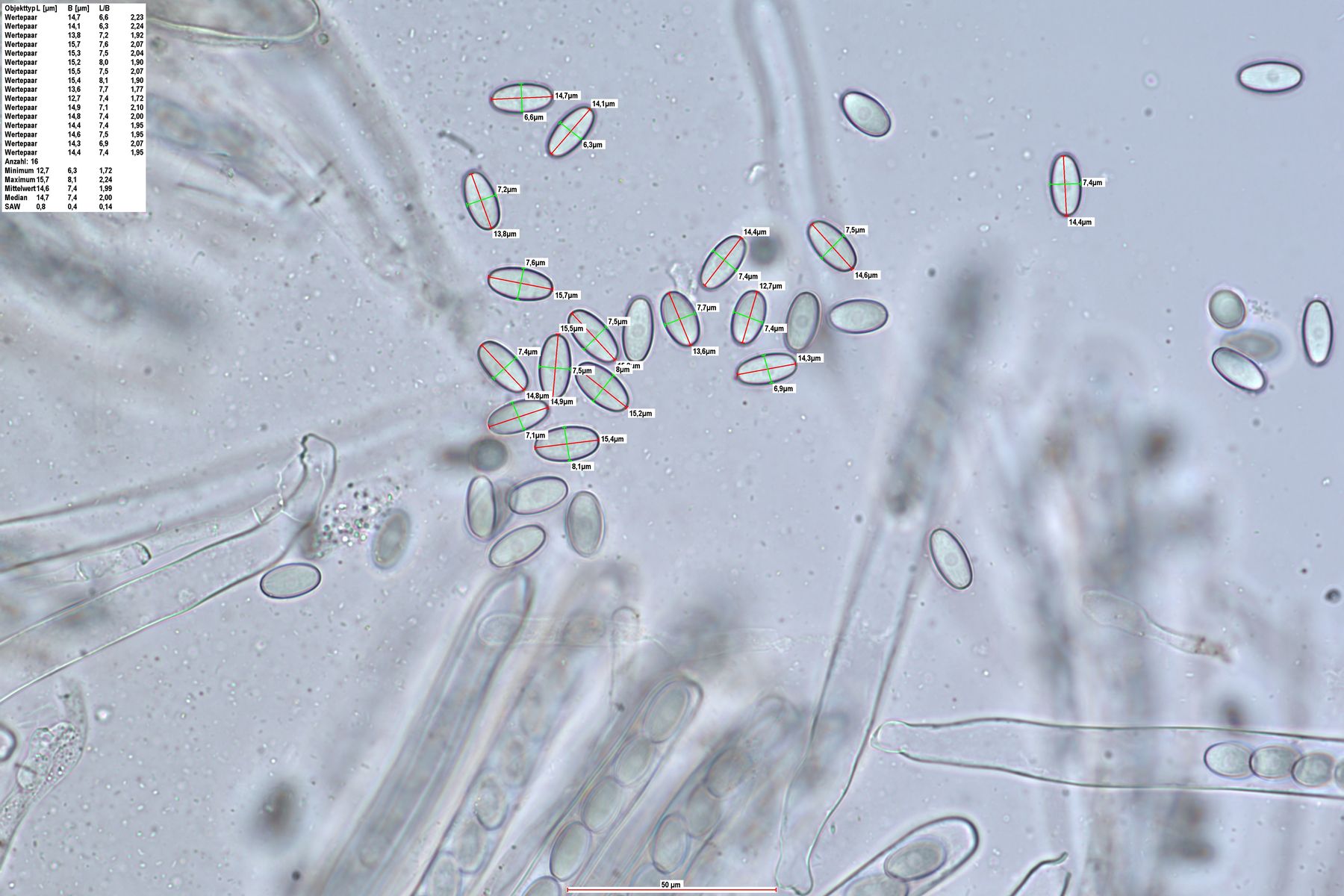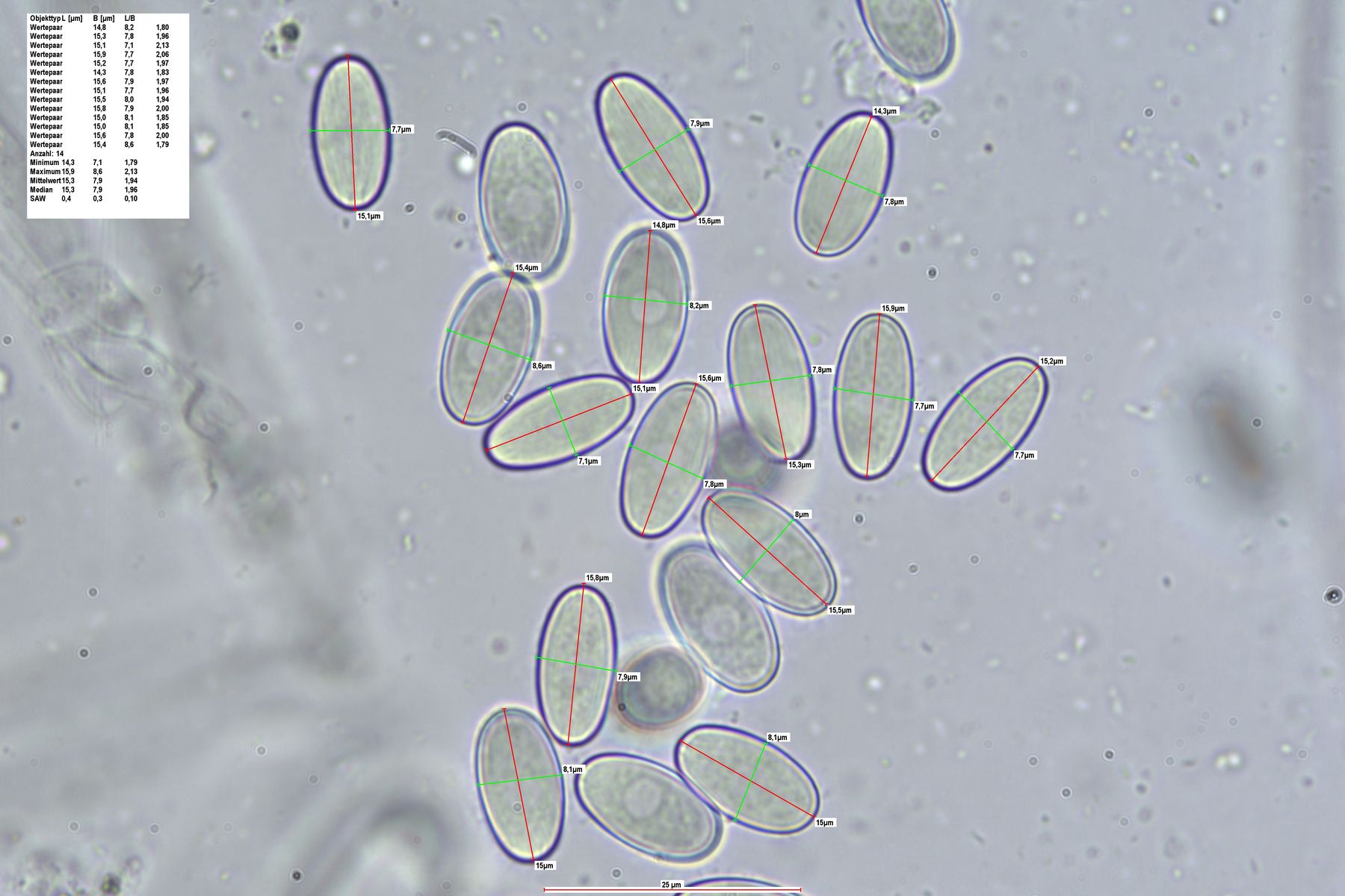 Sporen: 14,5-16 x 7-8,5 , mit schwach sichtbarer DeBary Bubble ?