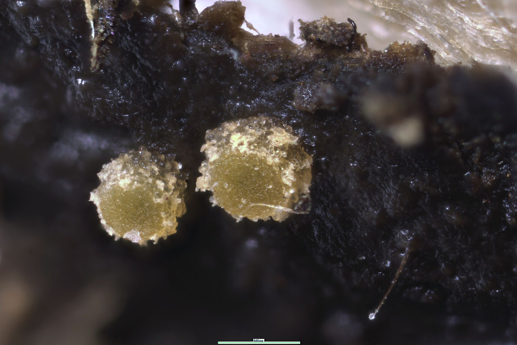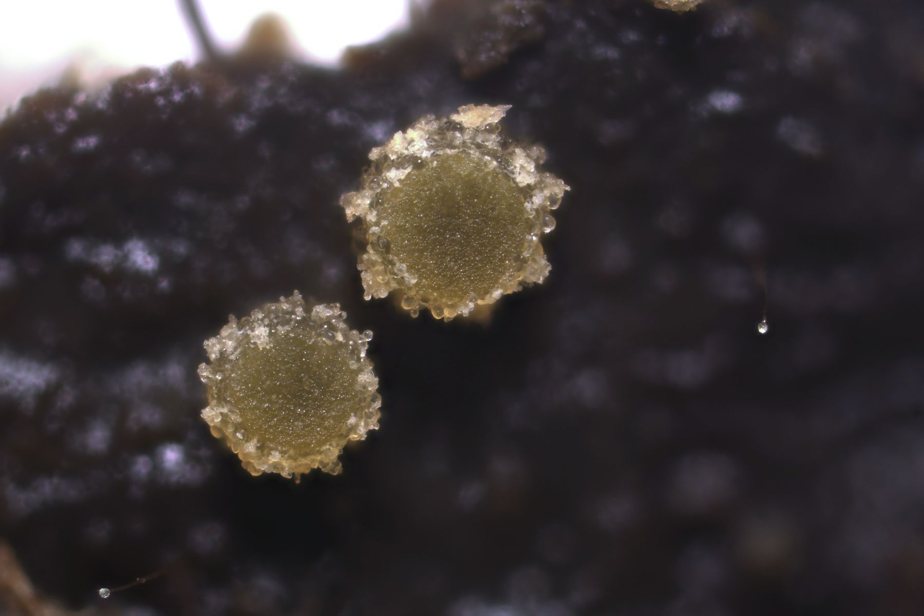 Apothecien max 0,5mm Durchmesser, gelb-bräunlich mit stark granuliertem Rand, ohne Haare