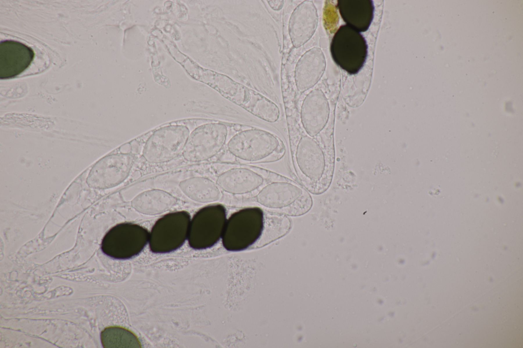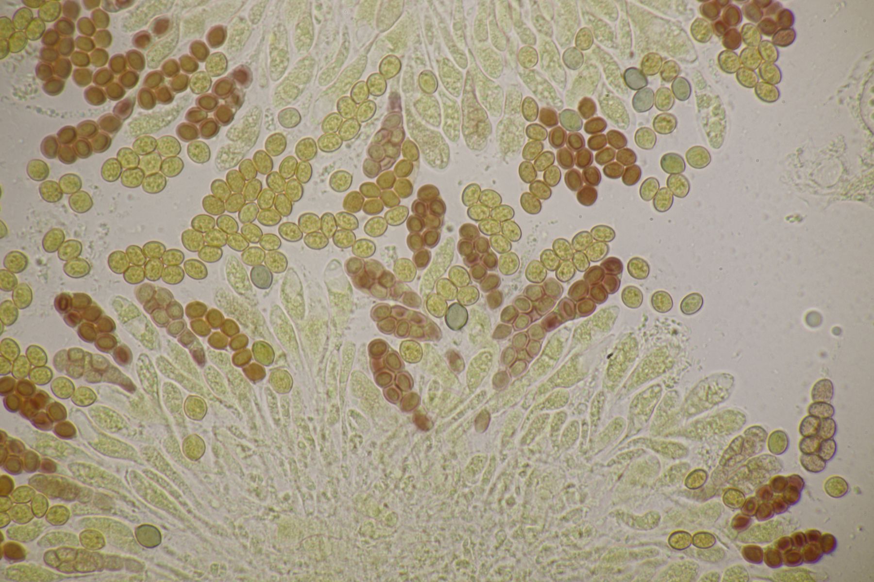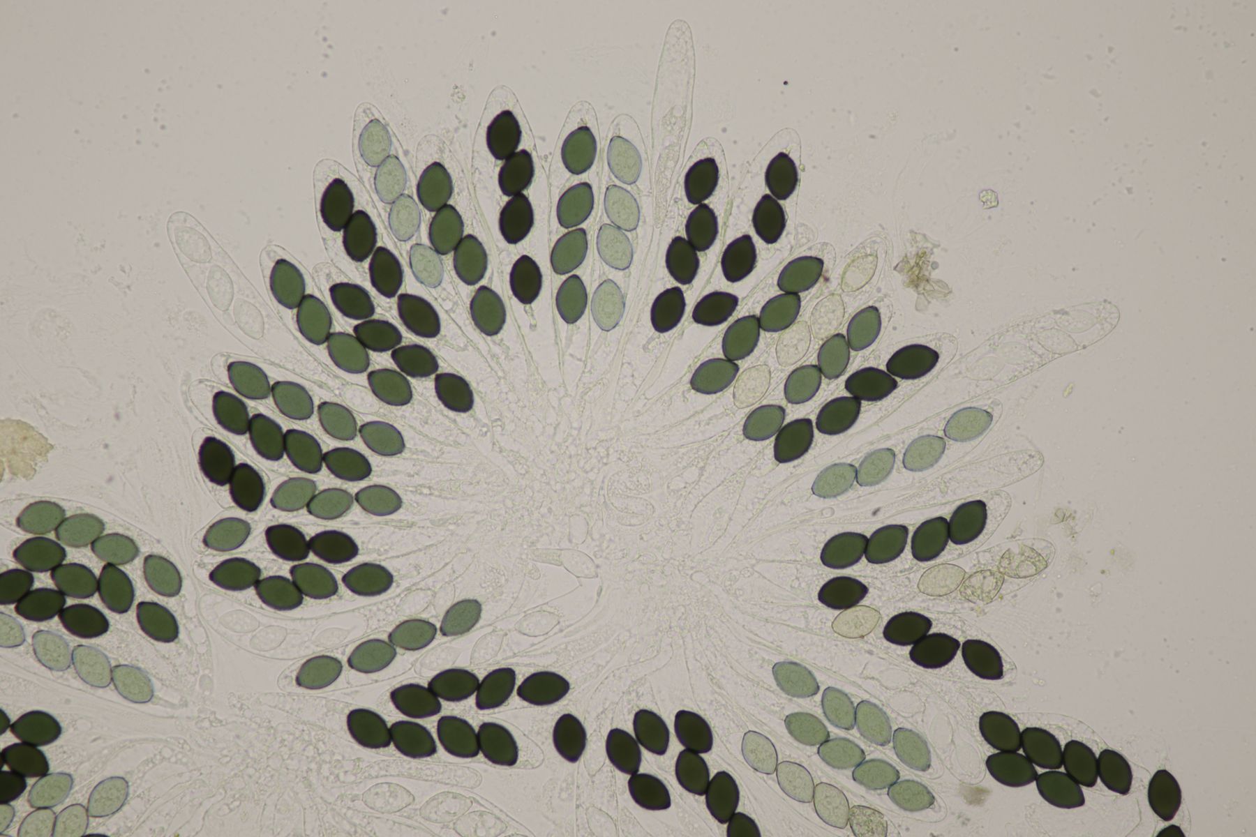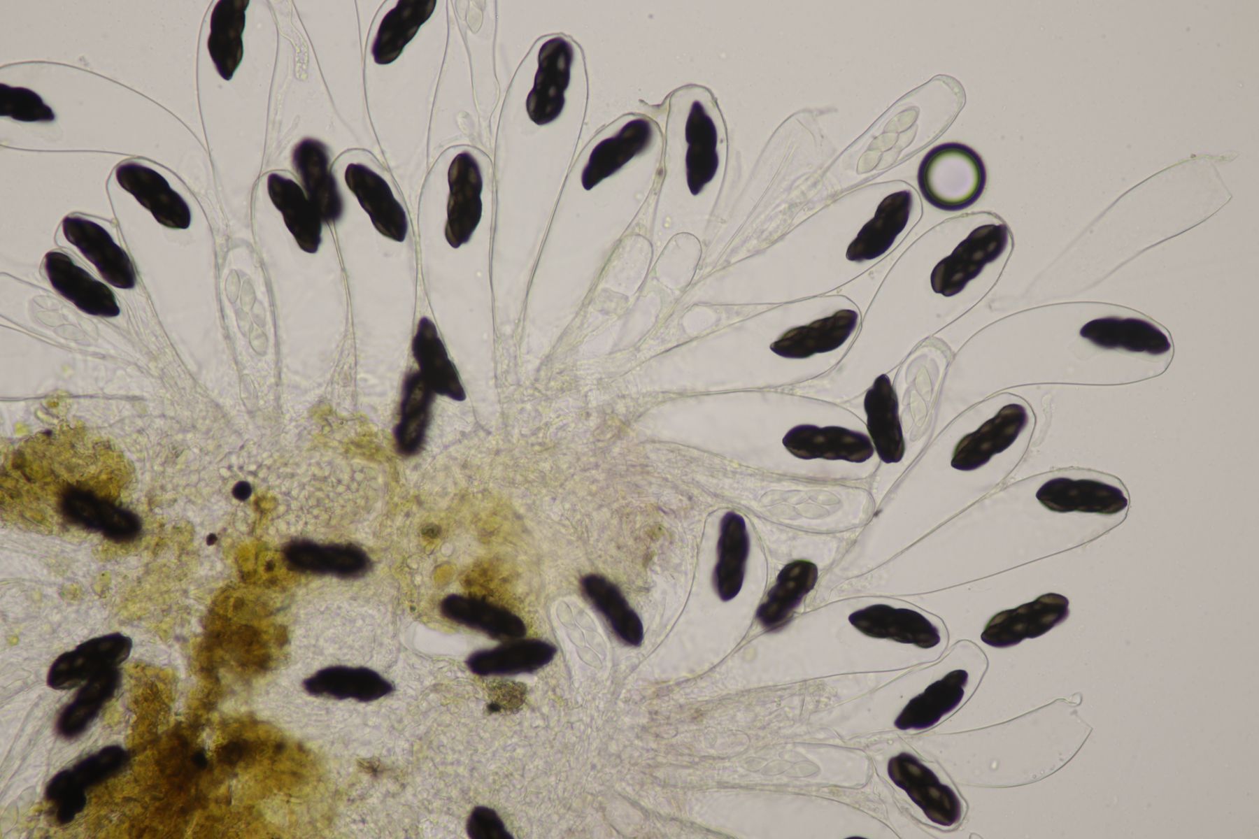 2. Dann kamen Saccobolusse. Bei diesem hier messen die Sporencluster 41-46 µm x 15-17 µm, die Sporen 17 x 7-8 µm. Auffällig die insgesamt sehr dunklen Sporen und die relativ kompakten, festen Cluster. Ohne gelbe Paraphysen also zur Sect. Eriobolus, wo man mit van Brummelen dann bei S. versicolor auskommt. Aber das scheint ja eine schwierige Gruppe zu sein, wenn man den Diskussionen hier im Forum folgt.