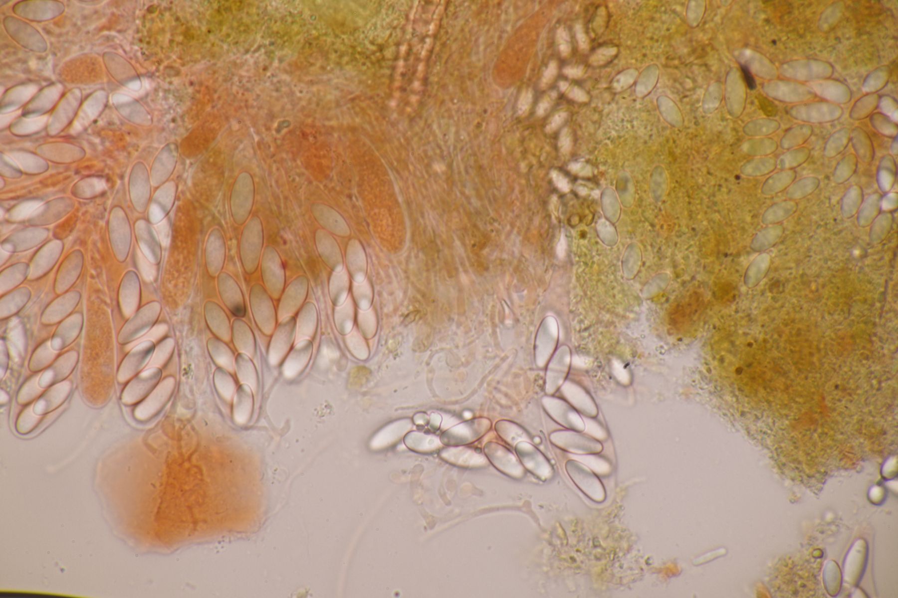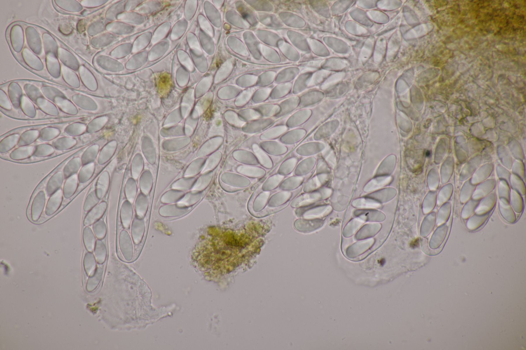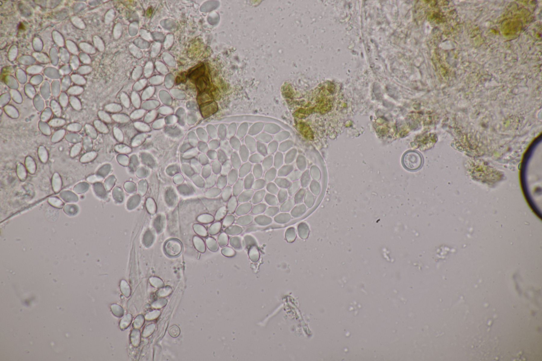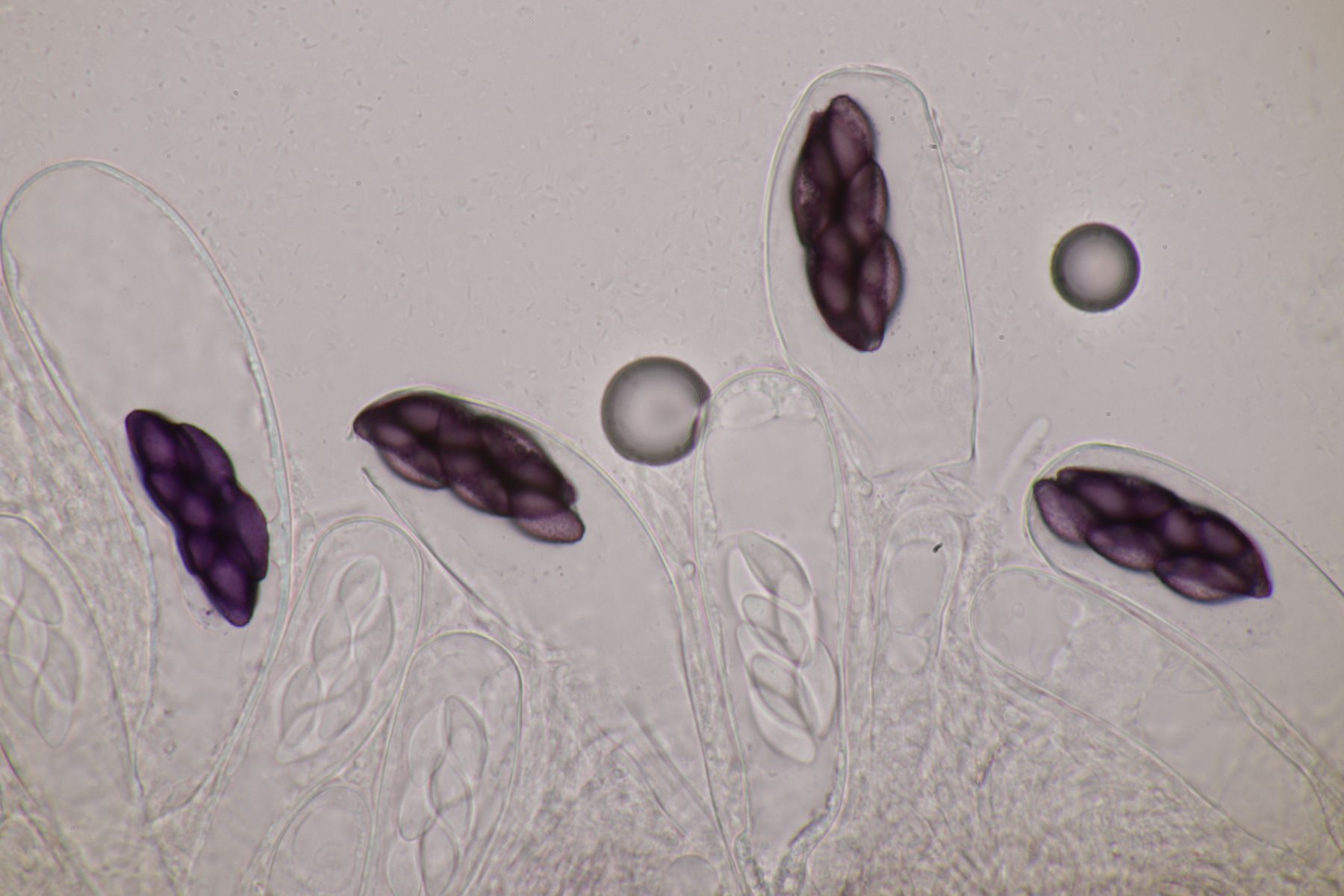 2. Dann kamen Saccobolusse. Bei diesem hier messen die Sporencluster 41-46 µm x 15-17 µm, die Sporen 17 x 7-8 µm. Auffällig die insgesamt sehr dunklen Sporen und die relativ kompakten, festen Cluster. Ohne gelbe Paraphysen also zur Sect. Eriobolus, wo man mit van Brummelen dann bei S. versicolor auskommt. Aber das scheint ja eine schwierige Gruppe zu sein, wenn man den Diskussionen hier im Forum folgt.