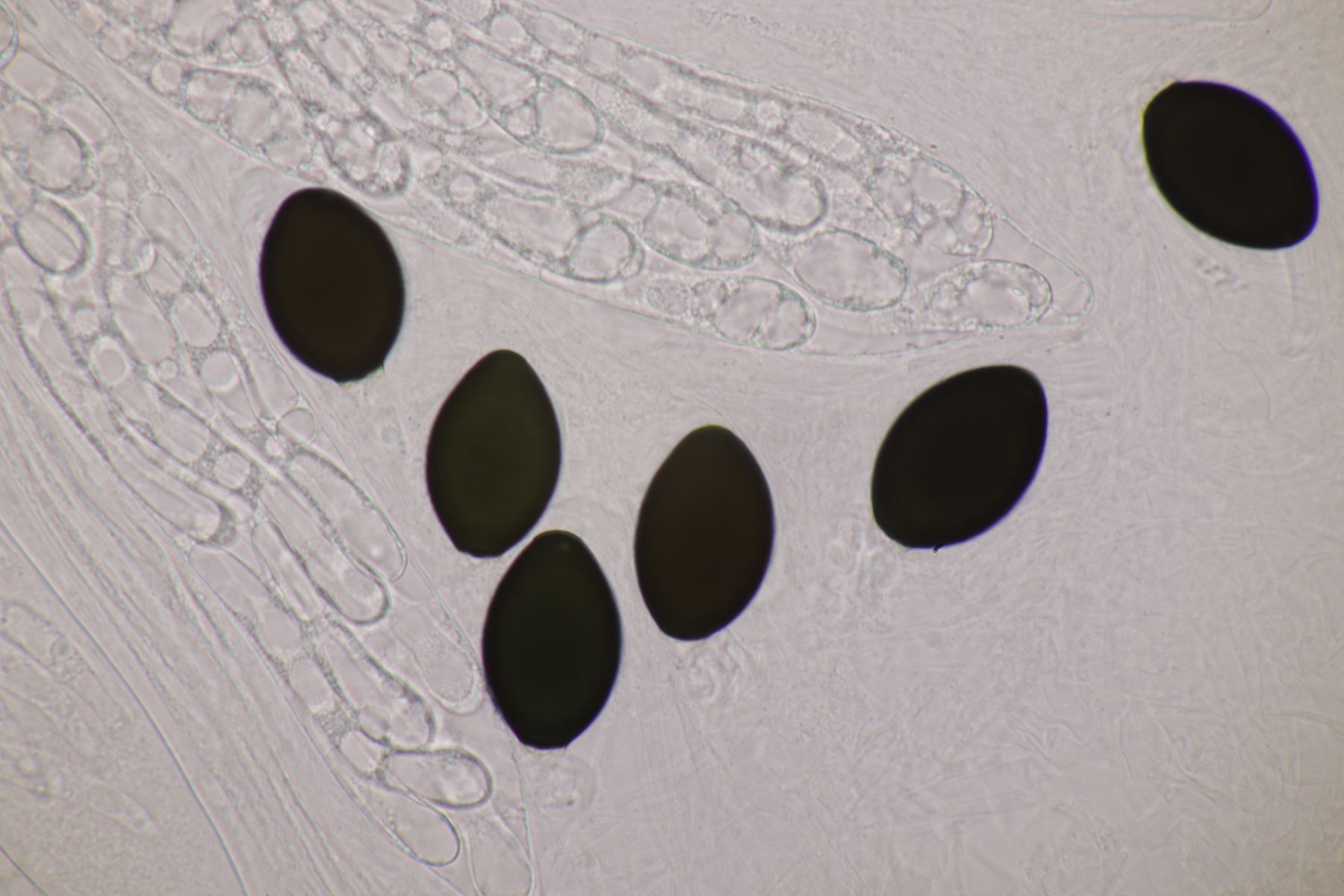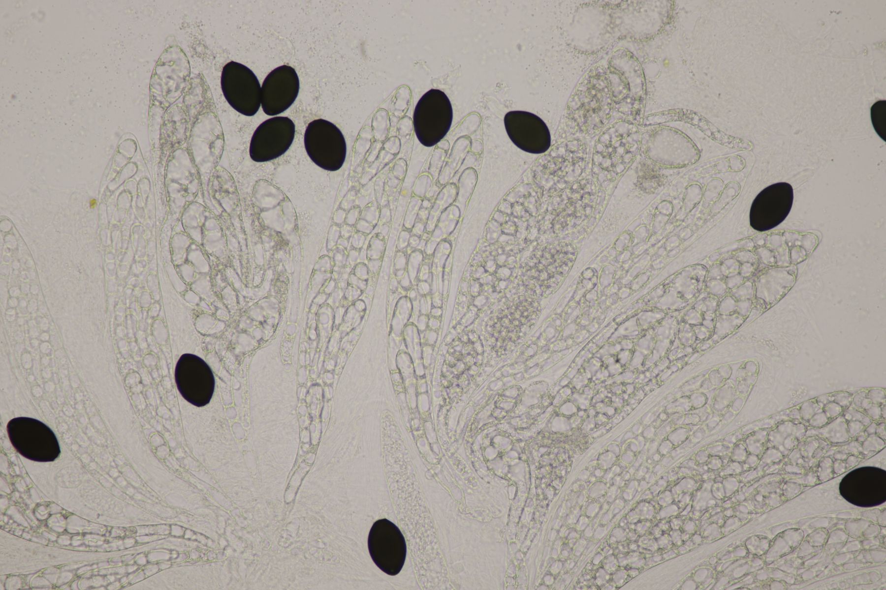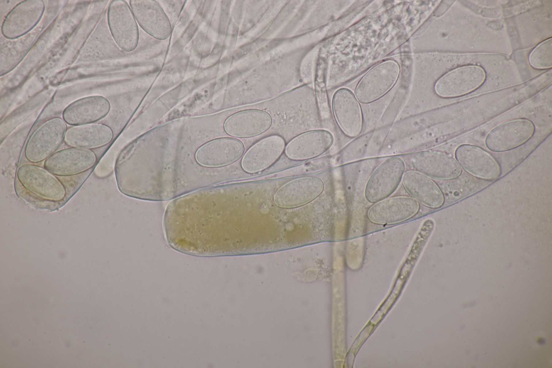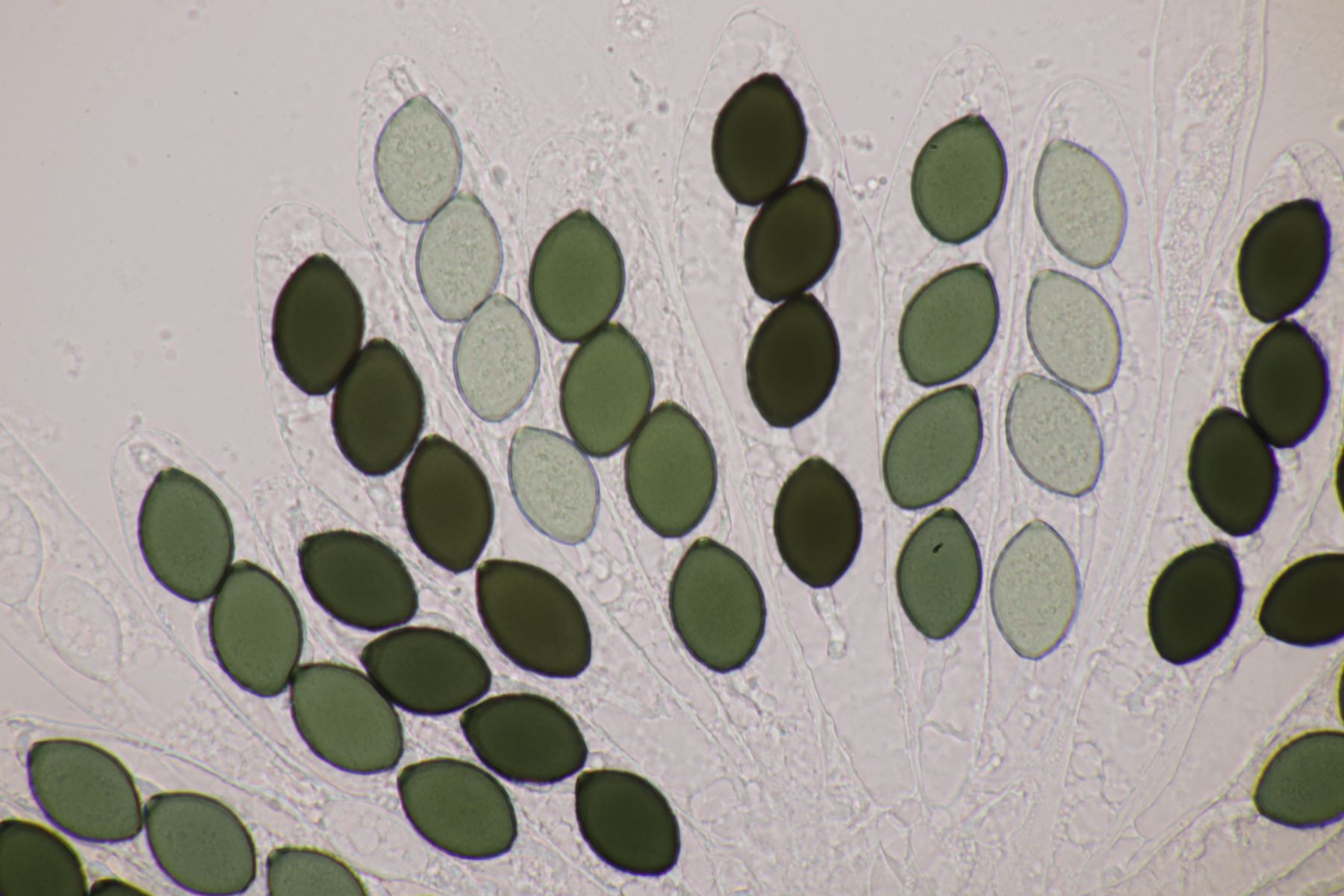 2. Dann kamen Saccobolusse. Bei diesem hier messen die Sporencluster 41-46 µm x 15-17 µm, die Sporen 17 x 7-8 µm. Auffällig die insgesamt sehr dunklen Sporen und die relativ kompakten, festen Cluster. Ohne gelbe Paraphysen also zur Sect. Eriobolus, wo man mit van Brummelen dann bei S. versicolor auskommt. Aber das scheint ja eine schwierige Gruppe zu sein, wenn man den Diskussionen hier im Forum folgt.