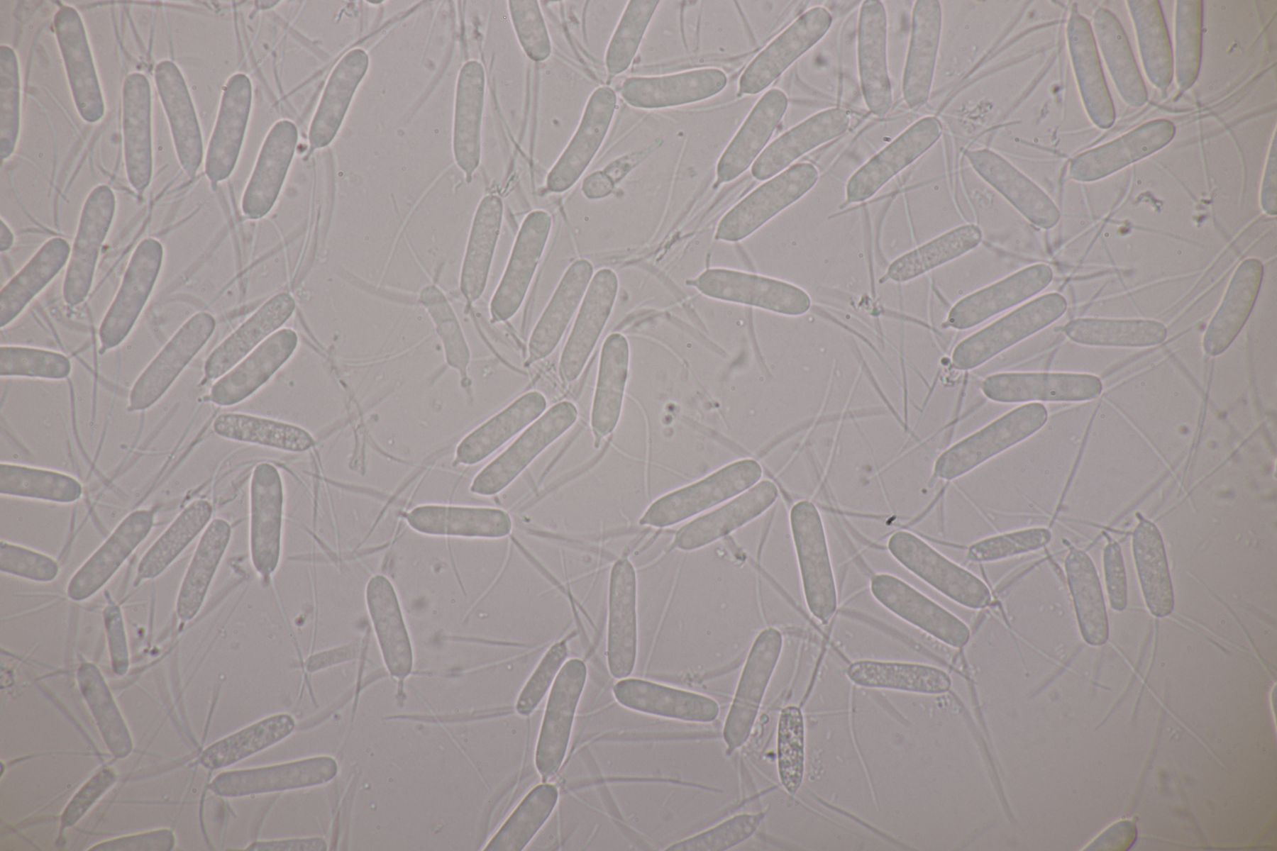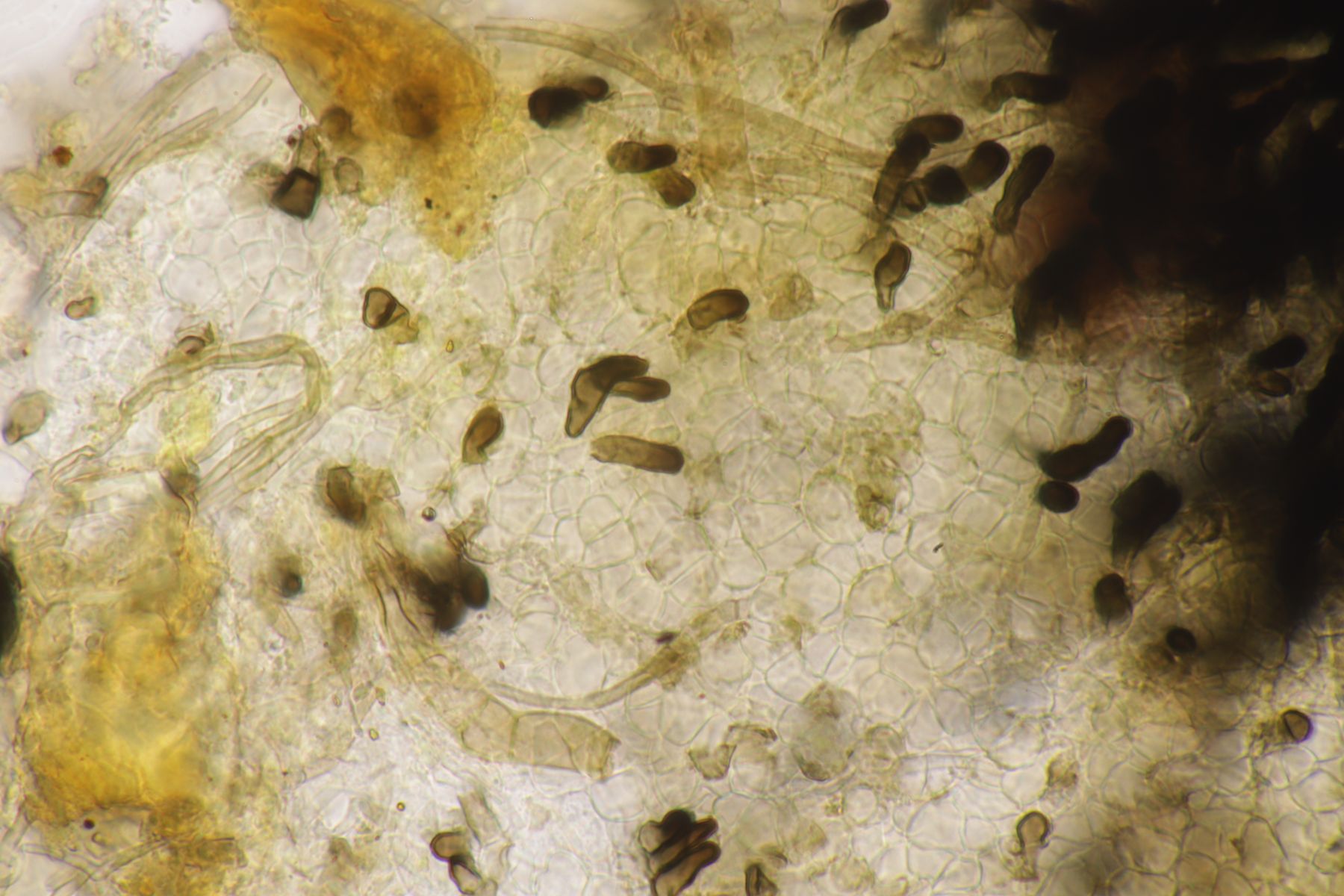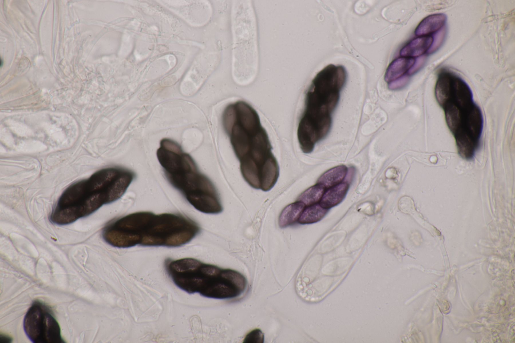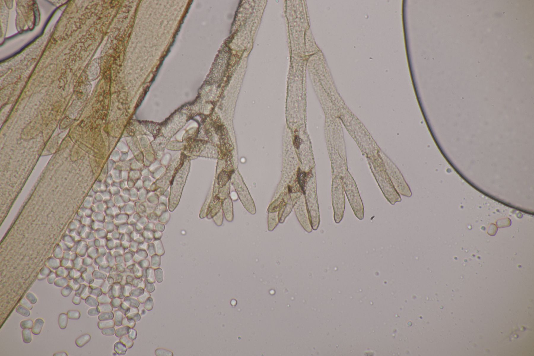 2. Dann kamen Saccobolusse. Bei diesem hier messen die Sporencluster 41-46 µm x 15-17 µm, die Sporen 17 x 7-8 µm. Auffällig die insgesamt sehr dunklen Sporen und die relativ kompakten, festen Cluster. Ohne gelbe Paraphysen also zur Sect. Eriobolus, wo man mit van Brummelen dann bei S. versicolor auskommt. Aber das scheint ja eine schwierige Gruppe zu sein, wenn man den Diskussionen hier im Forum folgt.