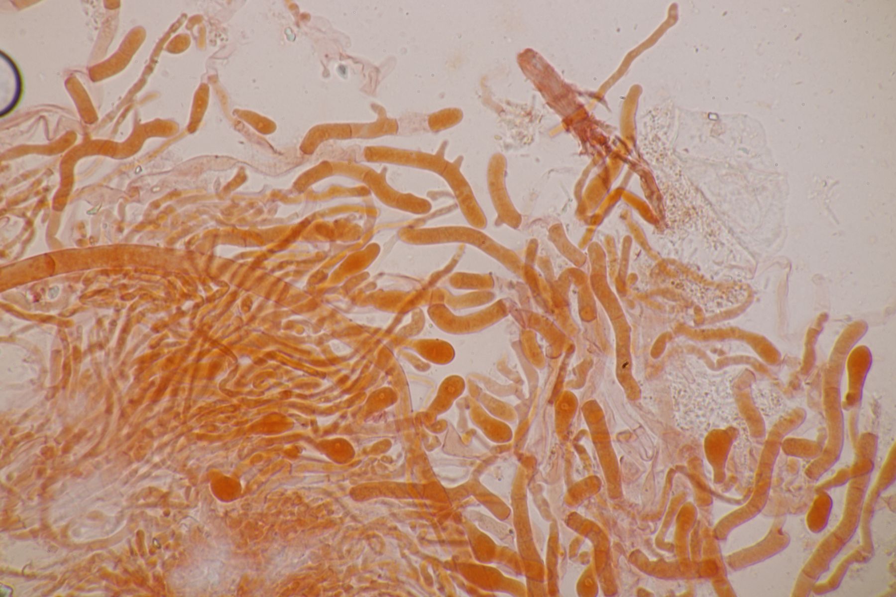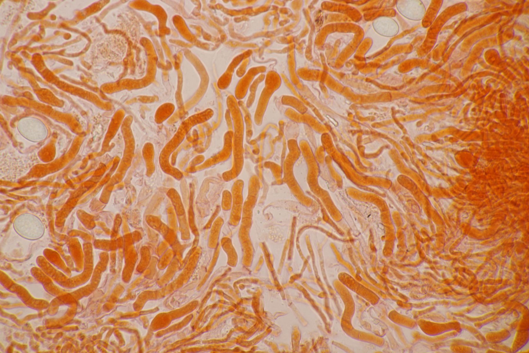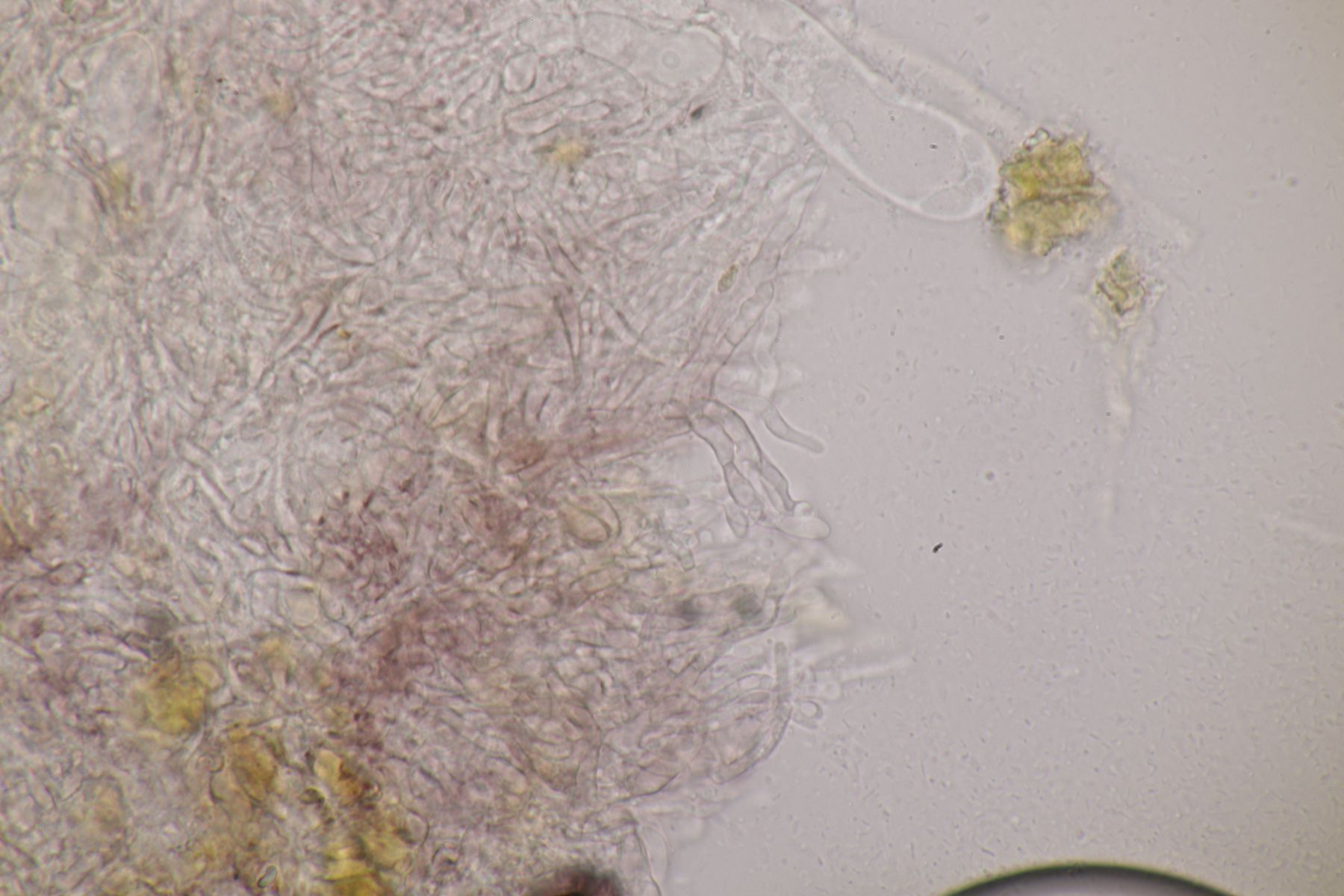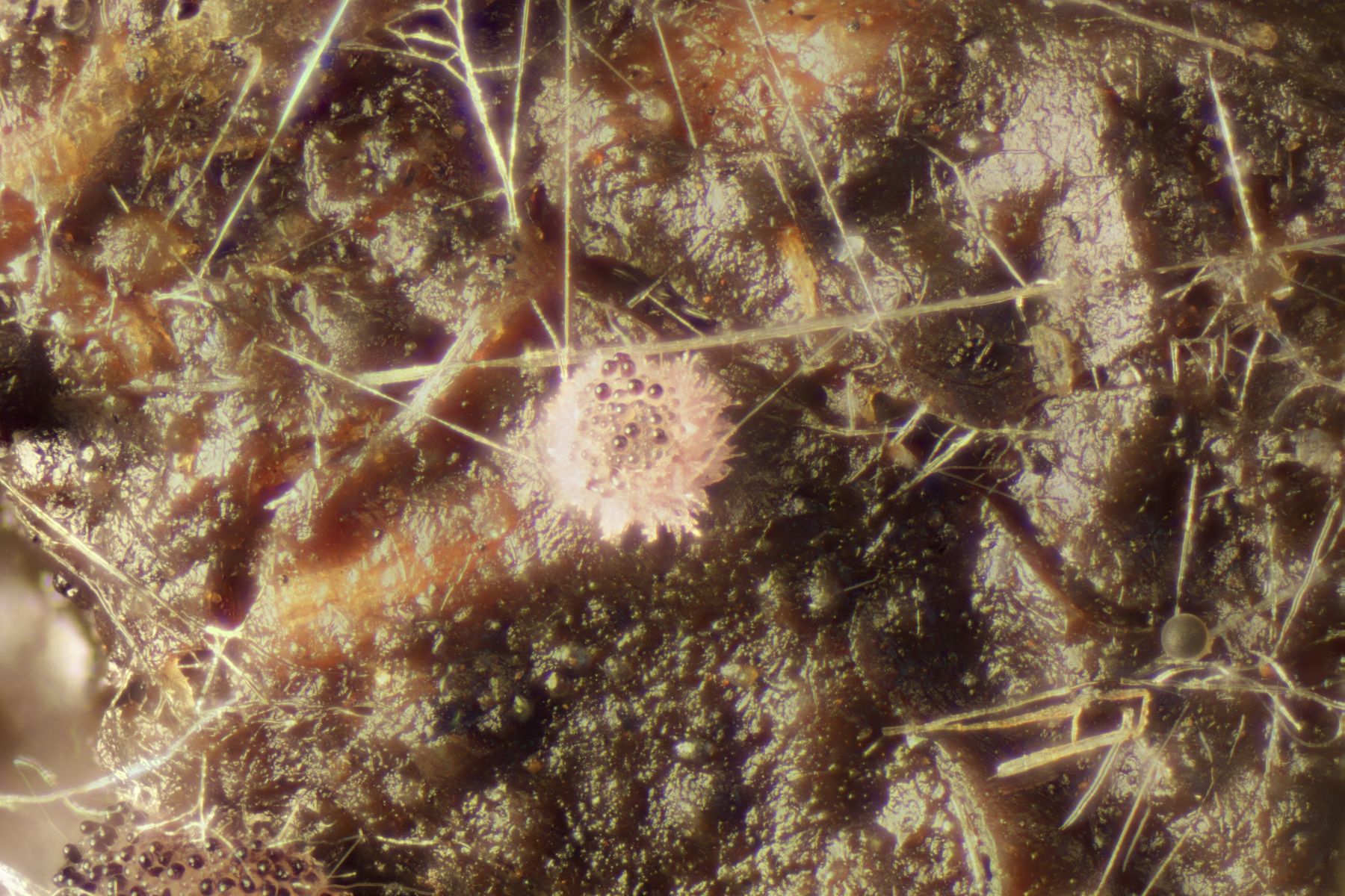 6. Wieder ein Saccobolus, diesmal mit auffälligen rosa-Tönen und einigem Gezumpel am Rand. Sporencluster messen 40-44 µm x 15-17 µm, Sporen liegen bei 16-18 µm x 8-9 µm. Ist das S. caesariatus oder sind diese Haare am Rand nur dm Wachstum in Kultur geschuldet und es ist auch was um S. versicolor?