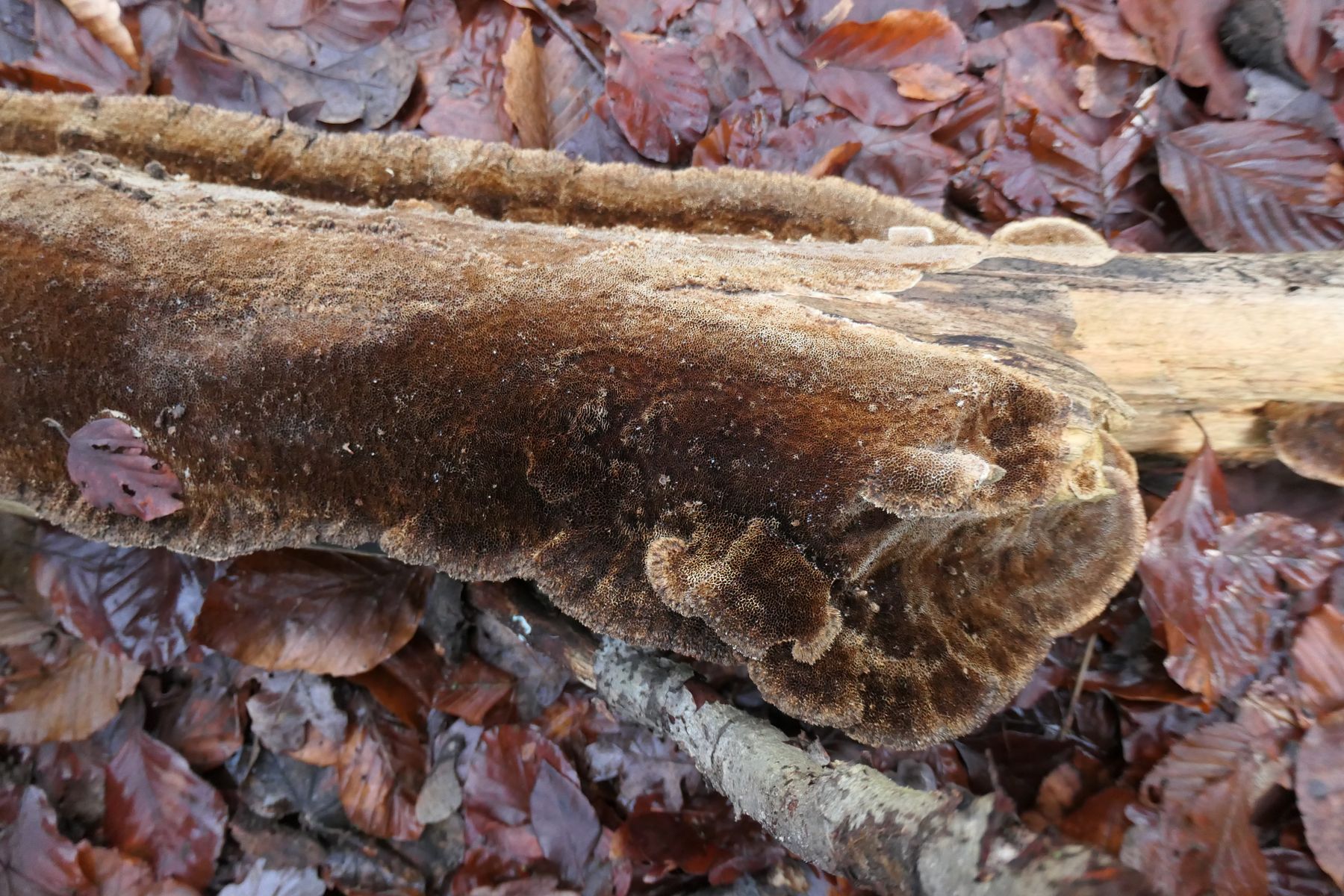 28.12.2022 bei CH-Oberwil b. Büren an einem toten Laubholzast (Fagus? Quercus?) sich 3-4 m ausdehnender braun-gräulicher Porling,